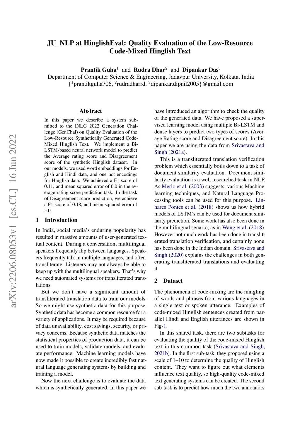 In this paper we describe a system submitted to the INLG 2022 Generation Challenge (GenChal) on Quality Evaluation of the Low-Resource Synthetically Generated Code-Mixed Hinglish Text. We implement a Bi-LSTM-based neural network model to predict the Average rating score and Disagreement score of the synthetic Hinglish dataset. In our models, we used word embeddings for English and Hindi data, and one hot encodings for Hinglish data. We achieved a F1 score of 0.11, and mean squared error of 6.0 in the average rating score prediction task. In the task of Disagreement score prediction, we achieve a F1 score of 0.18, and mean squared error of 5.0.