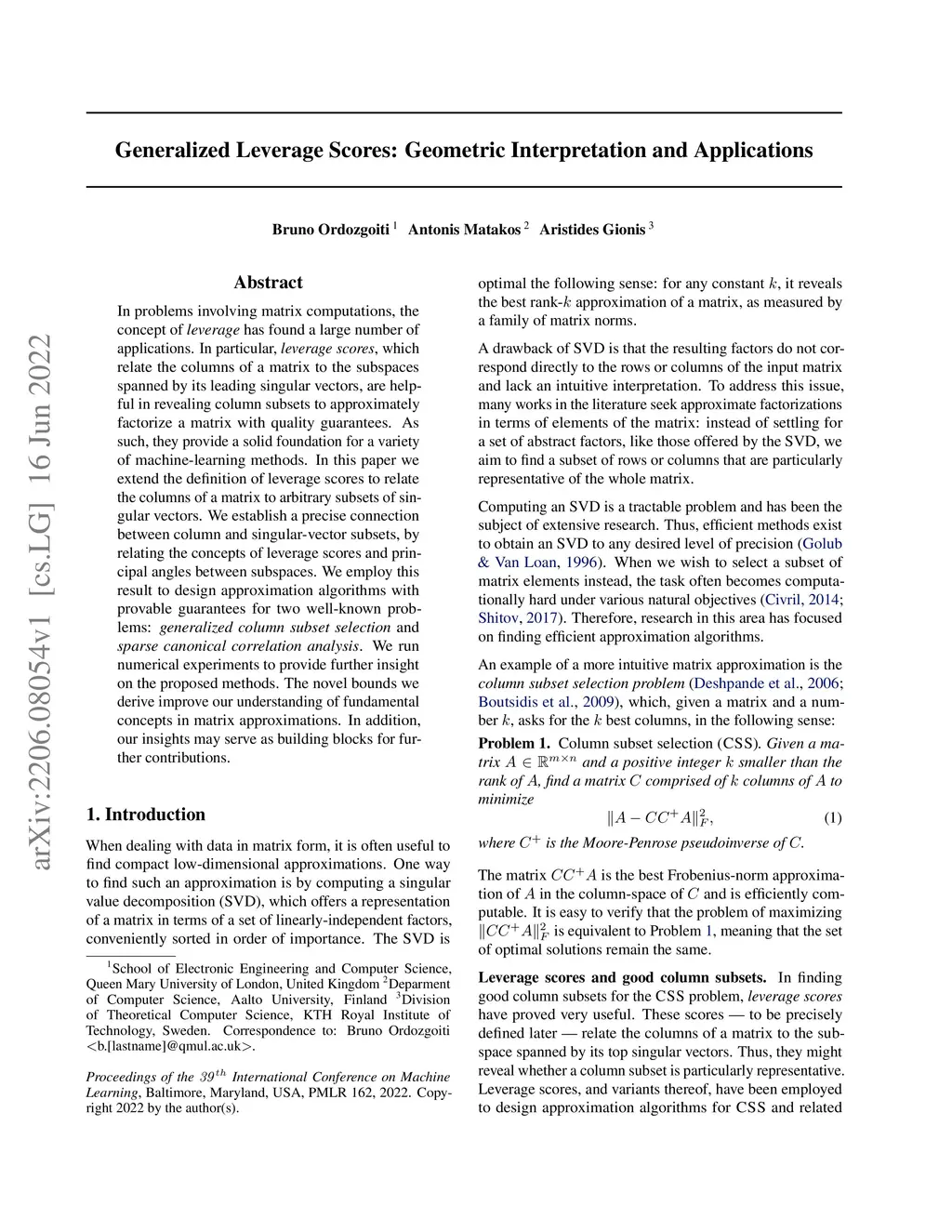 In problems involving matrix computations, the concept of leverage has found a large number of applications. In particular, leverage scores, which relate the columns of a matrix to the subspaces spanned by its leading singular vectors, are helpful in revealing column subsets to approximately factorize a matrix with quality guarantees. As such, they provide a solid foundation for a variety of machine-learning methods. In this paper we extend the definition of leverage scores to relate the columns of a matrix to arbitrary subsets of singular vectors. We establish a precise connection between column and singular-vector subsets, by relating the concepts of leverage scores and principal angles between subspaces. We employ this result to design approximation algorithms with provable guarantees for two well-known problems: generalized column subset selection and sparse canonical correlation analysis. We run numerical experiments to provide further insight on the proposed methods. The novel bounds we derive improve our understanding of fundamental concepts in matrix approximations. In addition, our insights may serve as building blocks for further contributions.