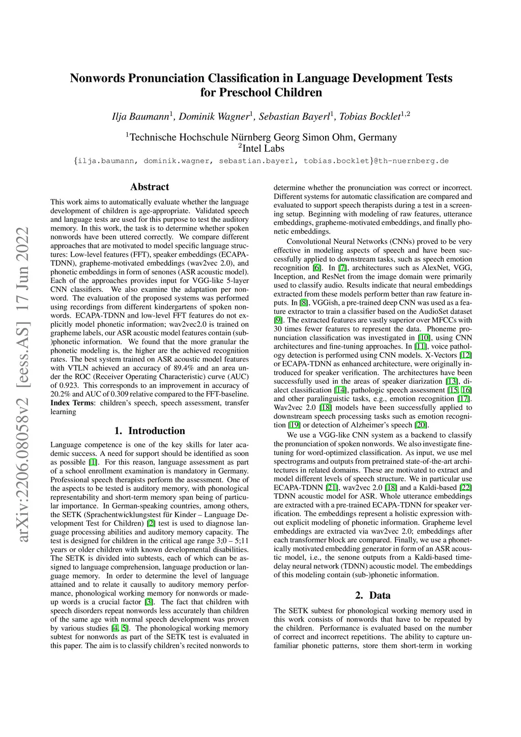 This work aims to automatically evaluate whether the language development of children is age-appropriate. Validated speech and language tests are used for this purpose to test the auditory memory. In this work, the task is to determine whether spoken nonwords have been uttered correctly. We compare different approaches that are motivated to model specific language structures: Low-level features (FFT), speaker embeddings (ECAPA-TDNN), grapheme-motivated embeddings (wav2vec 2.0), and phonetic embeddings in form of senones (ASR acoustic model). Each of the approaches provides input for VGG-like 5-layer CNN classifiers. We also examine the adaptation per nonword. The evaluation of the proposed systems was performed using recordings from different kindergartens of spoken nonwords. ECAPA-TDNN and low-level FFT features do not explicitly model phonetic information; wav2vec2.0 is trained on grapheme labels, our ASR acoustic model features contain (sub-)phonetic information. We found that the more granular the phonetic modeling is, the higher are the achieved recognition rates. The best system trained on ASR acoustic model features with VTLN achieved an accuracy of 89.4% and an area under the ROC (Receiver Operating Characteristic) curve (AUC) of 0.923. This corresponds to an improvement in accuracy of 20.2% and AUC of 0.309 relative compared to the FFT-baseline.