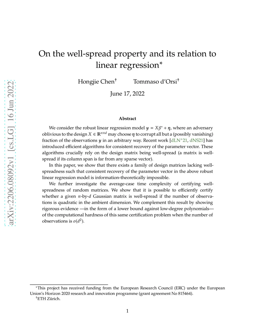 We consider the robust linear regression model , where an adversary oblivious to the design may choose to corrupt all but a (possibly vanishing) fraction of the observations in an arbitrary way. Recent work [dLN+21, dNS21] has introduced efficient algorithms for consistent recovery of the parameter vector. These algorithms crucially rely on the design matrix being well-spread (a matrix is well-spread if its column span is far from any sparse vector). In this paper, we show that there exists a family of design matrices lacking well-spreadness such that consistent recovery of the parameter vector in the above robust linear regression model is information-theoretically impossible. We further investigate the average-case time complexity of certifying well-spreadness of random matrices. We show that it is possible to efficiently certify whether a given -by- Gaussian matrix is well-spread if the number of observations is quadratic in the ambient dimension. We complement this result by showing rigorous evidence -- in the form of a lower bound against low-degree polynomials -- of the computational hardness of this same certification problem when the number of observations is .