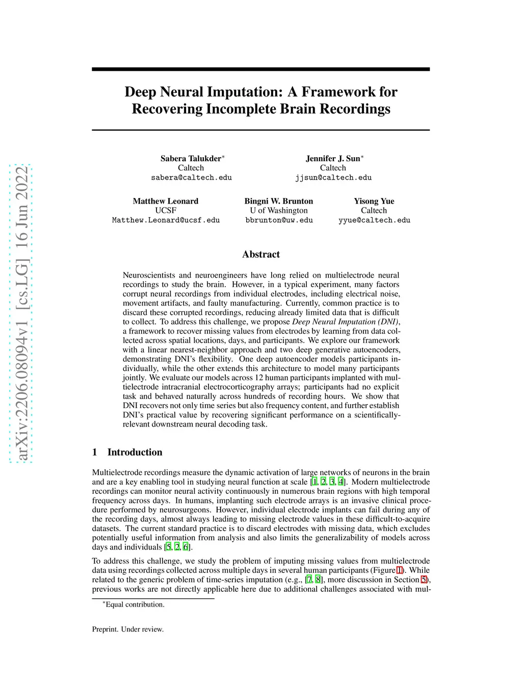 Neuroscientists and neuroengineers have long relied on multielectrode neural recordings to study the brain. However, in a typical experiment, many factors corrupt neural recordings from individual electrodes, including electrical noise, movement artifacts, and faulty manufacturing. Currently, common practice is to discard these corrupted recordings, reducing already limited data that is difficult to collect. To address this challenge, we propose Deep Neural Imputation (DNI), a framework to recover missing values from electrodes by learning from data collected across spatial locations, days, and participants. We explore our framework with a linear nearest-neighbor approach and two deep generative autoencoders, demonstrating DNI's flexibility. One deep autoencoder models participants individually, while the other extends this architecture to model many participants jointly. We evaluate our models across 12 human participants implanted with multielectrode intracranial electrocorticography arrays; participants had no explicit task and behaved naturally across hundreds of recording hours. We show that DNI recovers not only time series but also frequency content, and further establish DNI's practical value by recovering significant performance on a scientifically-relevant downstream neural decoding task.