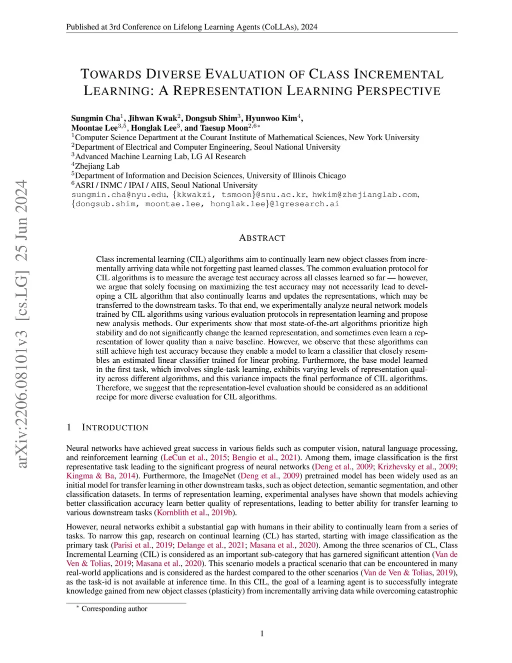Class incremental learning (CIL) algorithms aim to continually learn new object classes from incrementally arriving data while not forgetting past learned classes. The common evaluation protocol for CIL algorithms is to measure the average test accuracy across all classes learned so far -- however, we argue that solely focusing on maximizing the test accuracy may not necessarily lead to developing a CIL algorithm that also continually learns and updates the representations, which may be transferred to the downstream tasks. To that end, we experimentally analyze neural network models trained by CIL algorithms using various evaluation protocols in representation learning and propose new analysis methods. Our experiments show that most state-of-the-art algorithms prioritize high stability and do not significantly change the learned representation, and sometimes even learn a representation of lower quality than a naive baseline. However, we observe that these algorithms can still achieve high test accuracy because they enable a model to learn a classifier that closely resembles an estimated linear classifier trained for linear probing. Furthermore, the base model learned in the first task, which involves single-task learning, exhibits varying levels of representation quality across different algorithms, and this variance impacts the final performance of CIL algorithms. Therefore, we suggest that the representation-level evaluation should be considered as an additional recipe for more diverse evaluation for CIL algorithms.