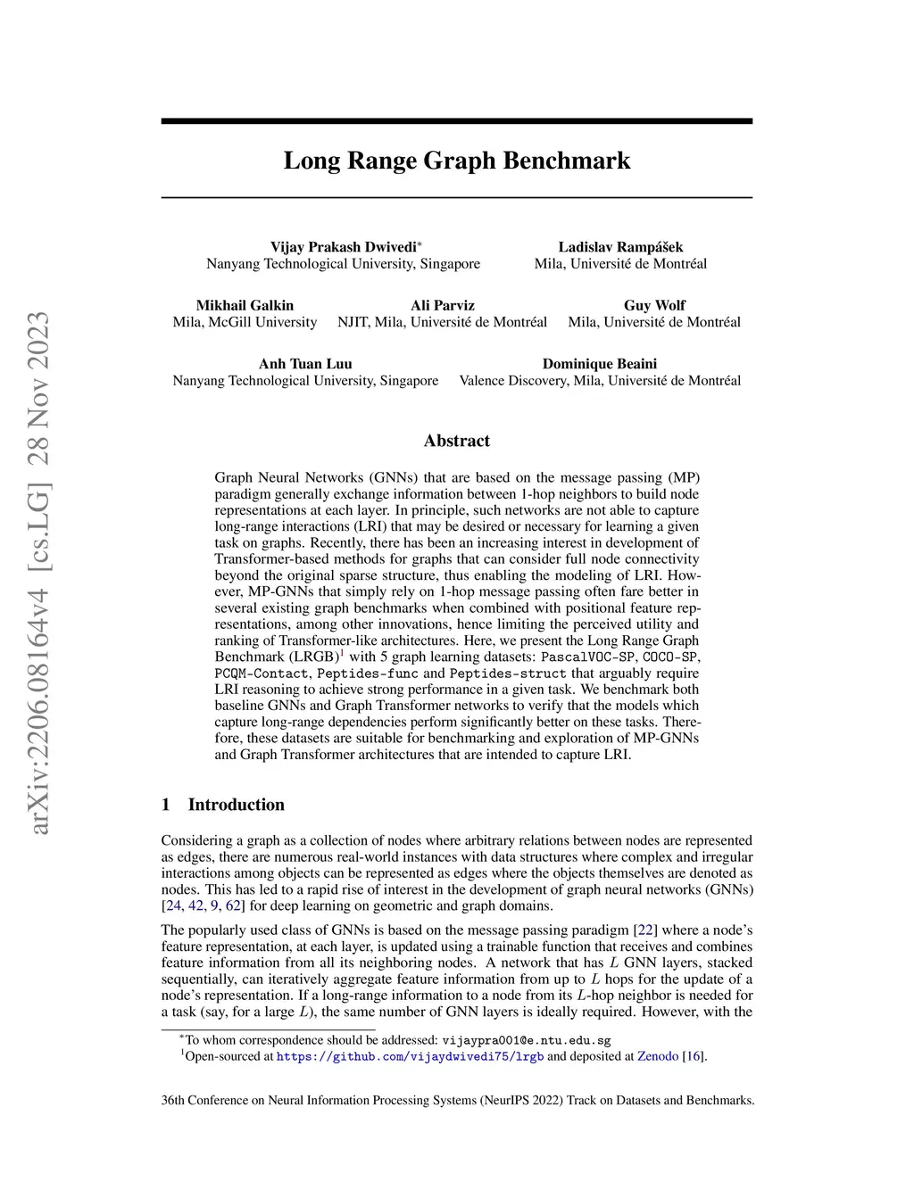 Graph Neural Networks (GNNs) that are based on the message passing (MP) paradigm generally exchange information between 1-hop neighbors to build node representations at each layer. In principle, such networks are not able to capture long-range interactions (LRI) that may be desired or necessary for learning a given task on graphs. Recently, there has been an increasing interest in development of Transformer-based methods for graphs that can consider full node connectivity beyond the original sparse structure, thus enabling the modeling of LRI. However, MP-GNNs that simply rely on 1-hop message passing often fare better in several existing graph benchmarks when combined with positional feature representations, among other innovations, hence limiting the perceived utility and ranking of Transformer-like architectures. Here, we present the Long Range Graph Benchmark (LRGB) with 5 graph learning datasets: PascalVOC-SP, COCO-SP, PCQM-Contact, Peptides-func and Peptides-struct that arguably require LRI reasoning to achieve strong performance in a given task. We benchmark both baseline GNNs and Graph Transformer networks to verify that the models which capture long-range dependencies perform significantly better on these tasks. Therefore, these datasets are suitable for benchmarking and exploration of MP-GNNs and Graph Transformer architectures that are intended to capture LRI.
