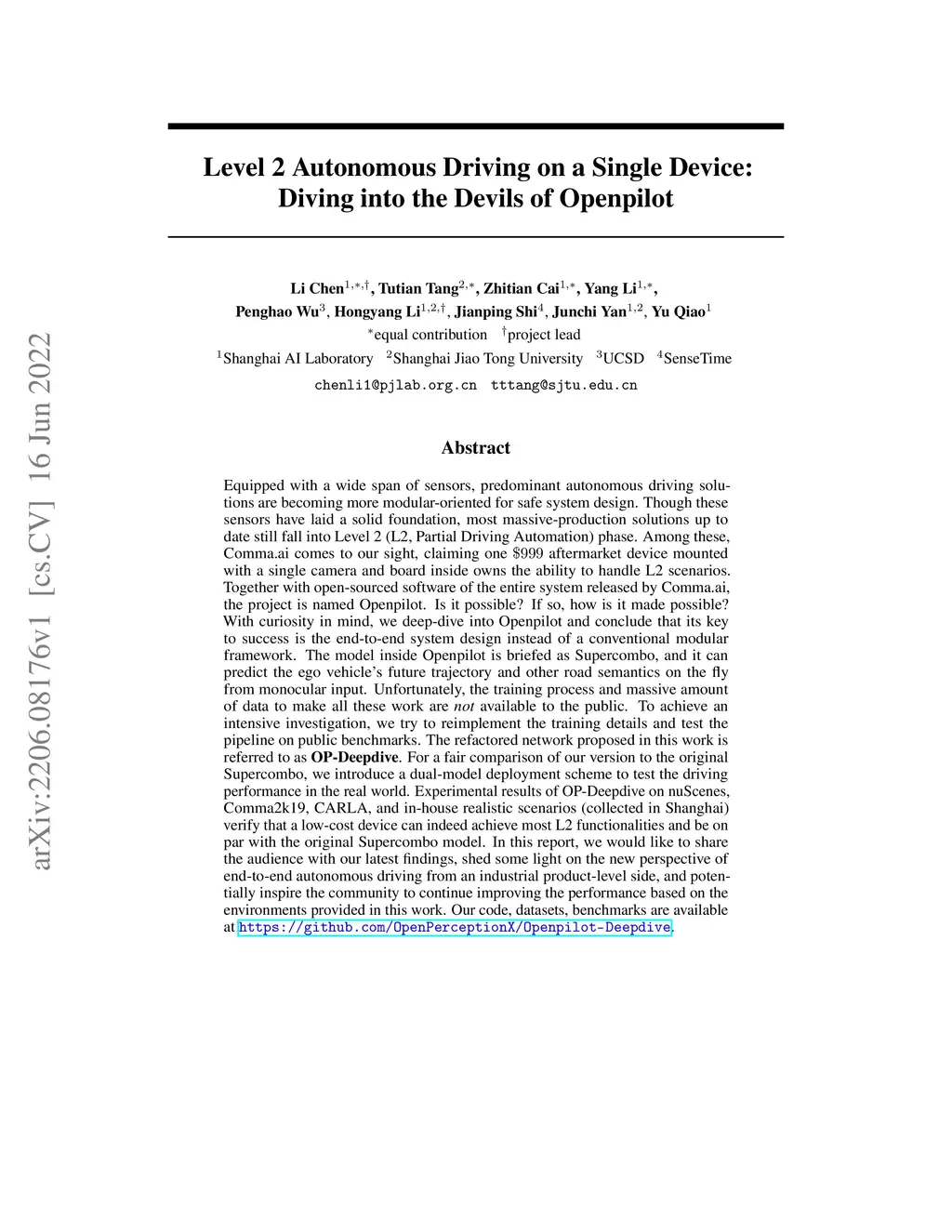 Equipped with a wide span of sensors, predominant autonomous driving solutions are becoming more modular-oriented for safe system design. Though these sensors have laid a solid foundation, most massive-production solutions up to date still fall into L2 phase. Among these, Comma.ai comes to our sight, claiming one $999 aftermarket device mounted with a single camera and board inside owns the ability to handle L2 scenarios. Together with open-sourced software of the entire system released by Comma.ai, the project is named Openpilot. Is it possible? If so, how is it made possible? With curiosity in mind, we deep-dive into Openpilot and conclude that its key to success is the end-to-end system design instead of a conventional modular framework. The model is briefed as Supercombo, and it can predict the ego vehicle's future trajectory and other road semantics on the fly from monocular input. Unfortunately, the training process and massive amount of data to make all these work are not publicly available. To achieve an intensive investigation, we try to reimplement the training details and test the pipeline on public benchmarks. The refactored network proposed in this work is referred to as OP-Deepdive. For a fair comparison of our version to the original Supercombo, we introduce a dual-model deployment scheme to test the driving performance in the real world. Experimental results on nuScenes, Comma2k19, CARLA, and in-house realistic scenarios verify that a low-cost device can indeed achieve most L2 functionalities and be on par with the original Supercombo model. In this report, we would like to share our latest findings, shed some light on the new perspective of end-to-end autonomous driving from an industrial product-level side, and potentially inspire the community to continue improving the performance. Our code, benchmarks are at https://github.com/OpenPerceptionX/Openpilot-Deepdive.