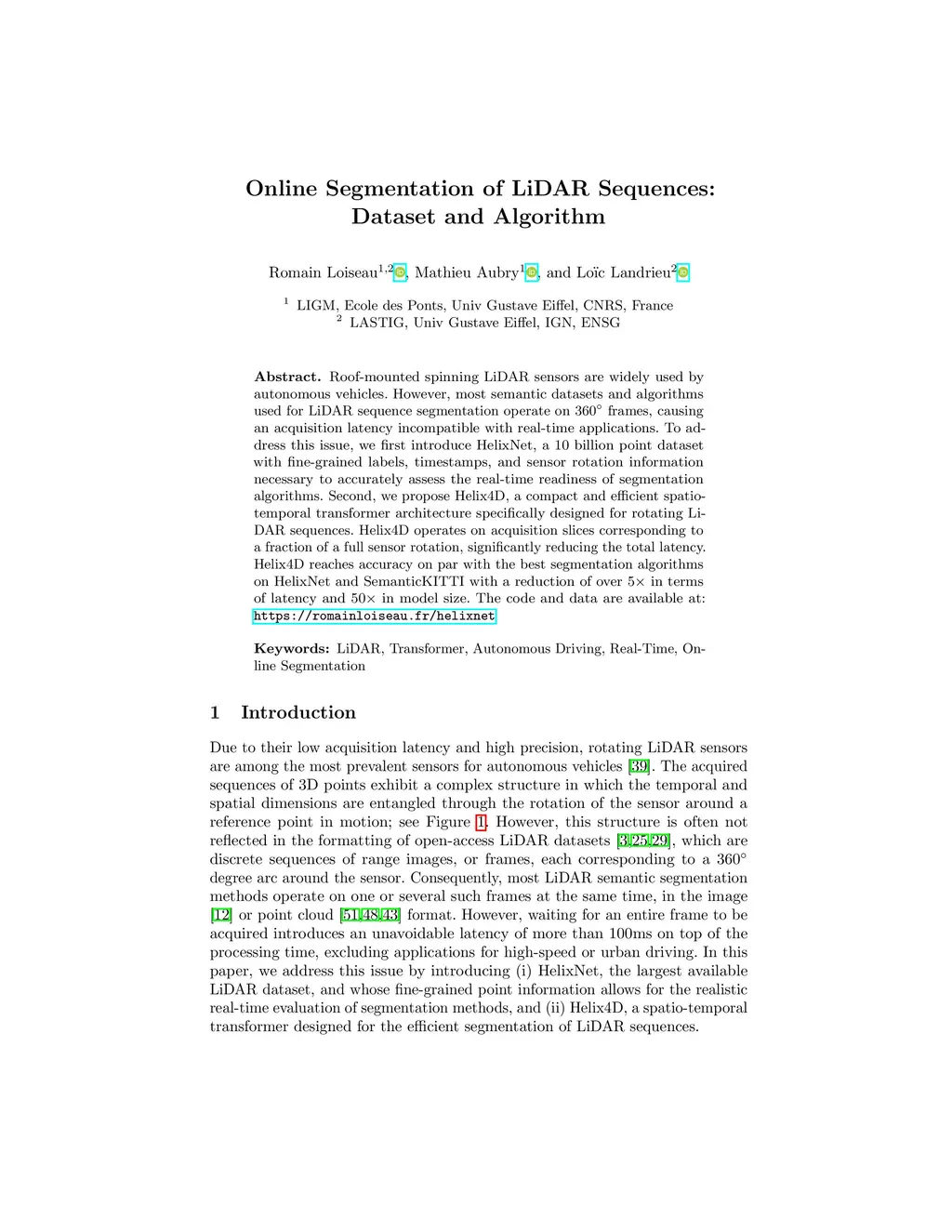 Roof-mounted spinning LiDAR sensors are widely used by autonomous vehicles. However, most semantic datasets and algorithms used for LiDAR sequence segmentation operate on frames, causing an acquisition latency incompatible with real-time applications. To address this issue, we first introduce HelixNet, a billion point dataset with fine-grained labels, timestamps, and sensor rotation information necessary to accurately assess the real-time readiness of segmentation algorithms. Second, we propose Helix4D, a compact and efficient spatio-temporal transformer architecture specifically designed for rotating LiDAR sequences. Helix4D operates on acquisition slices corresponding to a fraction of a full sensor rotation, significantly reducing the total latency. Helix4D reaches accuracy on par with the best segmentation algorithms on HelixNet and SemanticKITTI with a reduction of over in terms of latency and in model size. The code and data are available at: https://romainloiseau.fr/helixnet
