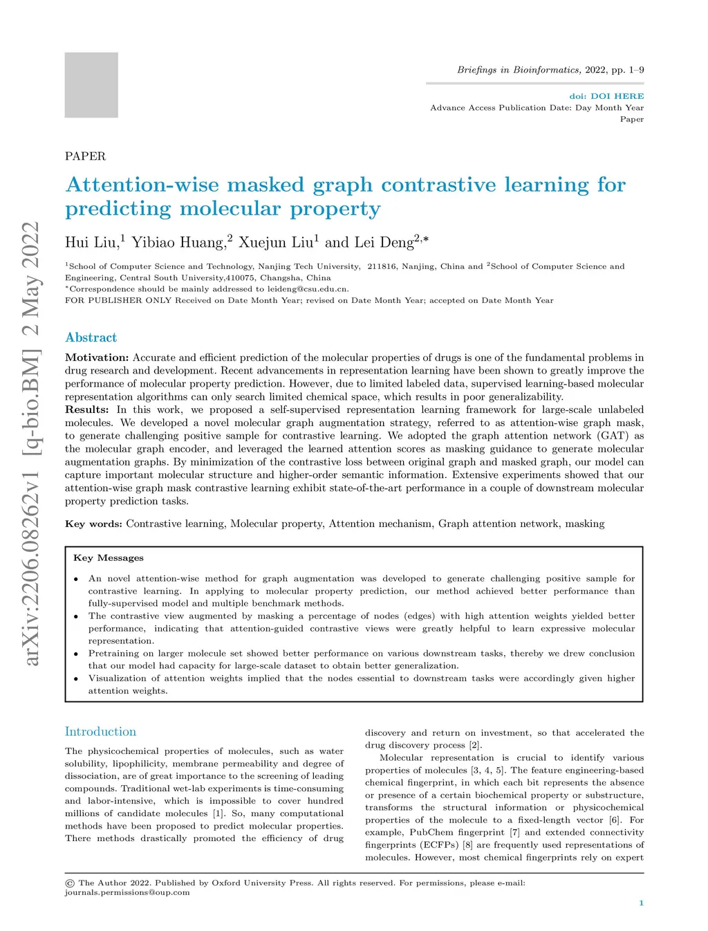 Accurate and efficient prediction of the molecular properties of drugs is one of the fundamental problems in drug research and development. Recent advancements in representation learning have been shown to greatly improve the performance of molecular property prediction. However, due to limited labeled data, supervised learning-based molecular representation algorithms can only search limited chemical space, which results in poor generalizability. In this work, we proposed a self-supervised representation learning framework for large-scale unlabeled molecules. We developed a novel molecular graph augmentation strategy, referred to as attention-wise graph mask, to generate challenging positive sample for contrastive learning. We adopted the graph attention network (GAT) as the molecular graph encoder, and leveraged the learned attention scores as masking guidance to generate molecular augmentation graphs. By minimization of the contrastive loss between original graph and masked graph, our model can capture important molecular structure and higher-order semantic information. Extensive experiments showed that our attention-wise graph mask contrastive learning exhibit state-of-the-art performance in a couple of downstream molecular property prediction tasks.
