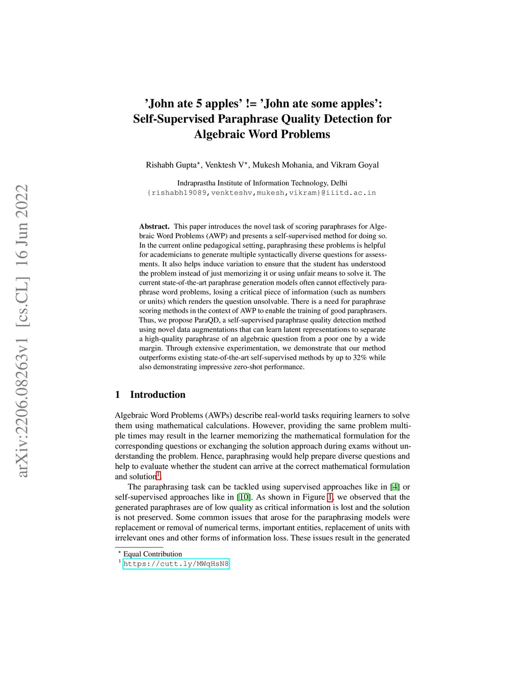 This paper introduces the novel task of scoring paraphrases for Algebraic Word Problems (AWP) and presents a self-supervised method for doing so. In the current online pedagogical setting, paraphrasing these problems is helpful for academicians to generate multiple syntactically diverse questions for assessments. It also helps induce variation to ensure that the student has understood the problem instead of just memorizing it or using unfair means to solve it. The current state-of-the-art paraphrase generation models often cannot effectively paraphrase word problems, losing a critical piece of information (such as numbers or units) which renders the question unsolvable. There is a need for paraphrase scoring methods in the context of AWP to enable the training of good paraphrasers. Thus, we propose ParaQD, a self-supervised paraphrase quality detection method using novel data augmentations that can learn latent representations to separate a high-quality paraphrase of an algebraic question from a poor one by a wide margin. Through extensive experimentation, we demonstrate that our method outperforms existing state-of-the-art self-supervised methods by up to 32% while also demonstrating impressive zero-shot performance.