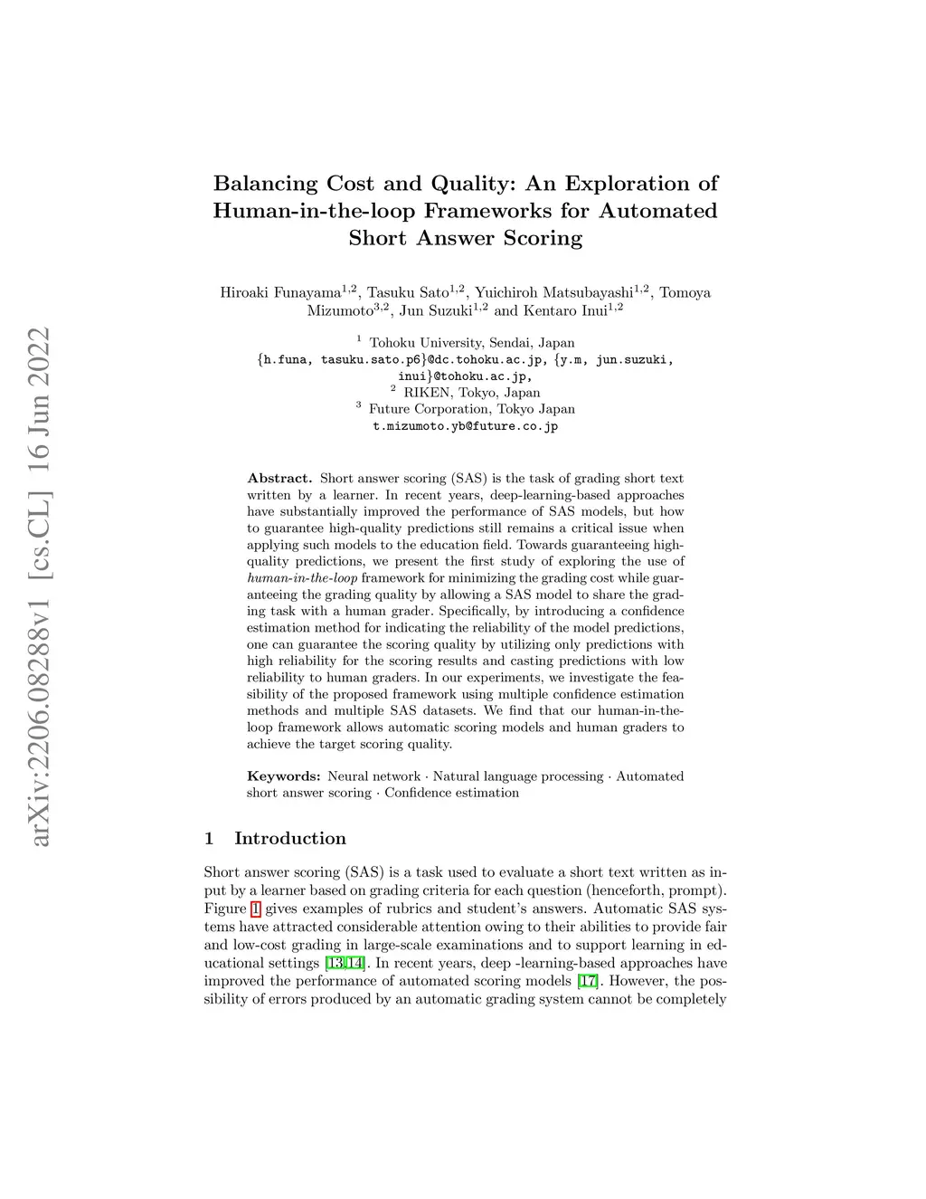 Short answer scoring (SAS) is the task of grading short text written by a learner. In recent years, deep-learning-based approaches have substantially improved the performance of SAS models, but how to guarantee high-quality predictions still remains a critical issue when applying such models to the education field. Towards guaranteeing high-quality predictions, we present the first study of exploring the use of human-in-the-loop framework for minimizing the grading cost while guaranteeing the grading quality by allowing a SAS model to share the grading task with a human grader. Specifically, by introducing a confidence estimation method for indicating the reliability of the model predictions, one can guarantee the scoring quality by utilizing only predictions with high reliability for the scoring results and casting predictions with low reliability to human graders. In our experiments, we investigate the feasibility of the proposed framework using multiple confidence estimation methods and multiple SAS datasets. We find that our human-in-the-loop framework allows automatic scoring models and human graders to achieve the target scoring quality.