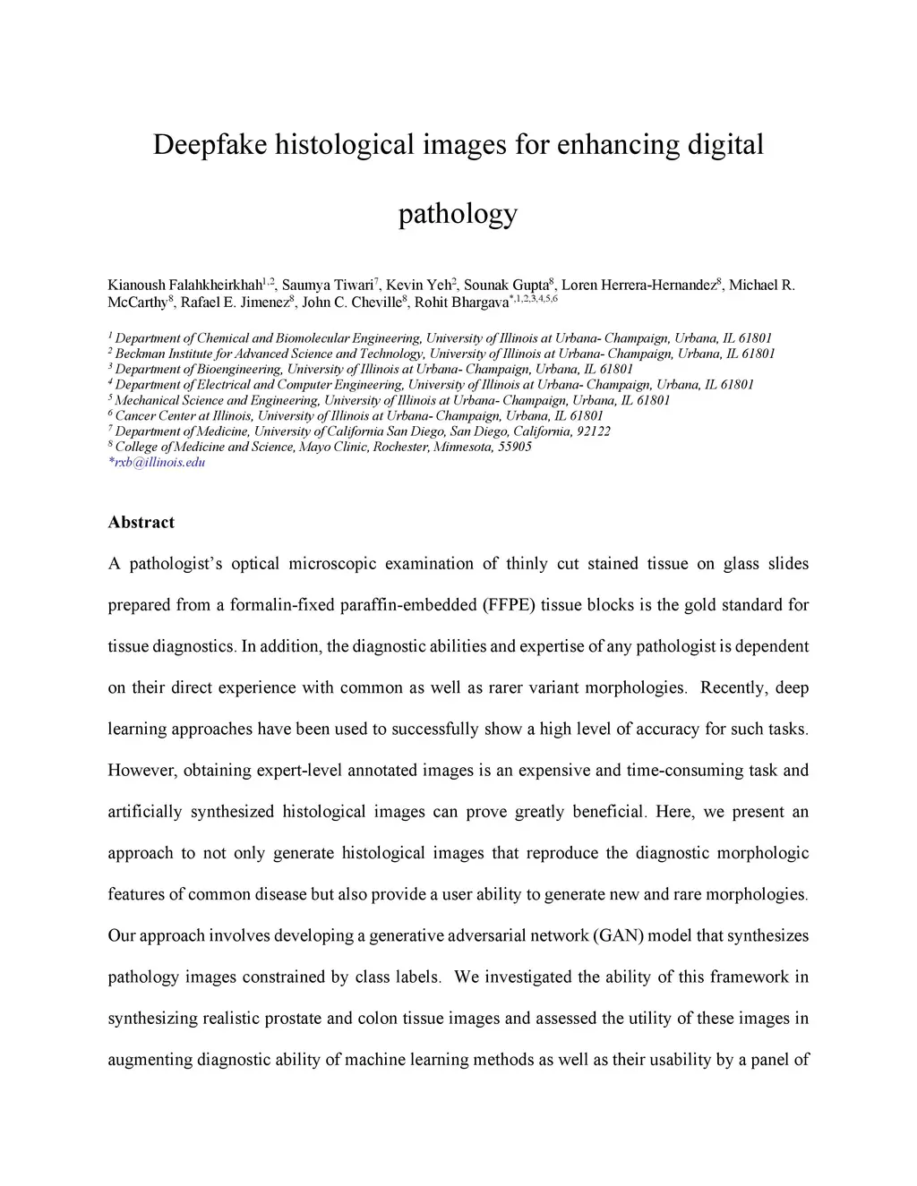 An optical microscopic examination of thinly cut stained tissue on glass slides prepared from a FFPE tissue blocks is the gold standard for tissue diagnostics. In addition, the diagnostic abilities and expertise of any pathologist is dependent on their direct experience with common as well as rarer variant morphologies. Recently, deep learning approaches have been used to successfully show a high level of accuracy for such tasks. However, obtaining expert-level annotated images is an expensive and time-consuming task and artificially synthesized histological images can prove greatly beneficial. Here, we present an approach to not only generate histological images that reproduce the diagnostic morphologic features of common disease but also provide a user ability to generate new and rare morphologies. Our approach involves developing a generative adversarial network model that synthesizes pathology images constrained by class labels. We investigated the ability of this framework in synthesizing realistic prostate and colon tissue images and assessed the utility of these images in augmenting diagnostic ability of machine learning methods as well as their usability by a panel of experienced anatomic pathologists. Synthetic data generated by our framework performed similar to real data in training a deep learning model for diagnosis. Pathologists were not able to distinguish between real and synthetic images and showed a similar level of inter-observer agreement for prostate cancer grading. We extended the approach to significantly more complex images from colon biopsies and showed that the complex microenvironment in such tissues can also be reproduced. Finally, we present the ability for a user to generate deepfake histological images via a simple markup of sematic labels.