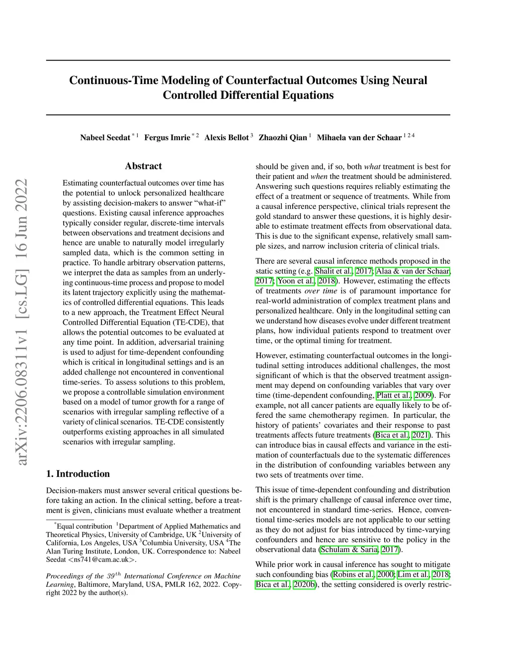 Estimating counterfactual outcomes over time has the potential to unlock personalized healthcare by assisting decision-makers to answer ''what-iF'' questions. Existing causal inference approaches typically consider regular, discrete-time intervals between observations and treatment decisions and hence are unable to naturally model irregularly sampled data, which is the common setting in practice. To handle arbitrary observation patterns, we interpret the data as samples from an underlying continuous-time process and propose to model its latent trajectory explicitly using the mathematics of controlled differential equations. This leads to a new approach, the Treatment Effect Neural Controlled Differential Equation (TE-CDE), that allows the potential outcomes to be evaluated at any time point. In addition, adversarial training is used to adjust for time-dependent confounding which is critical in longitudinal settings and is an added challenge not encountered in conventional time-series. To assess solutions to this problem, we propose a controllable simulation environment based on a model of tumor growth for a range of scenarios with irregular sampling reflective of a variety of clinical scenarios. TE-CDE consistently outperforms existing approaches in all simulated scenarios with irregular sampling.