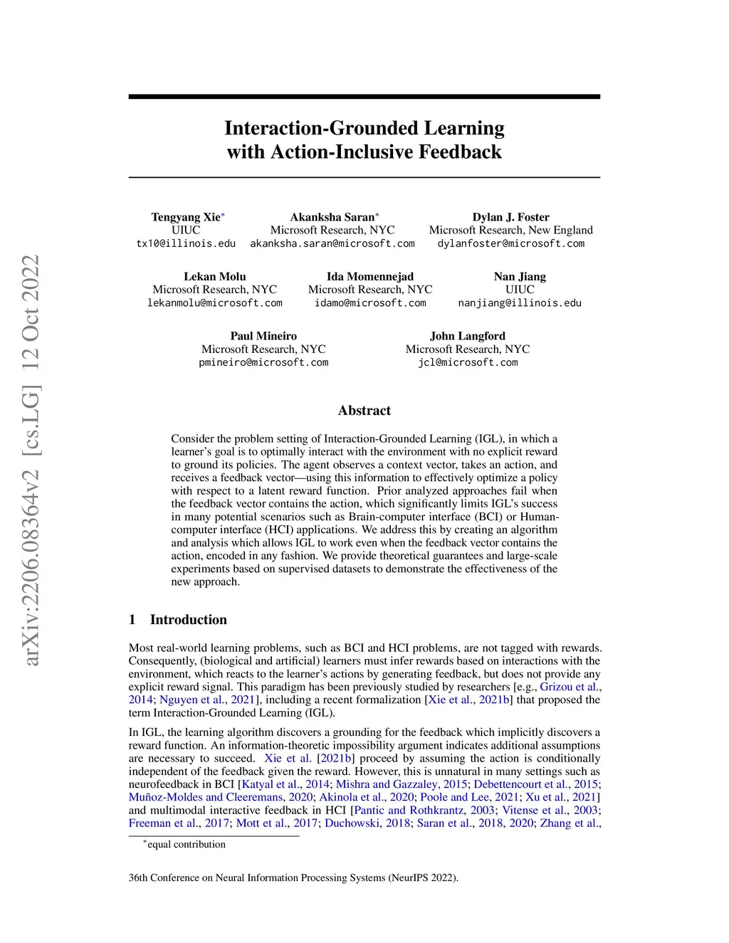 Consider the problem setting of Interaction-Grounded Learning (IGL), in which a learner's goal is to optimally interact with the environment with no explicit reward to ground its policies. The agent observes a context vector, takes an action, and receives a feedback vector, using this information to effectively optimize a policy with respect to a latent reward function. Prior analyzed approaches fail when the feedback vector contains the action, which significantly limits IGL's success in many potential scenarios such as Brain-computer interface (BCI) or Human-computer interface (HCI) applications. We address this by creating an algorithm and analysis which allows IGL to work even when the feedback vector contains the action, encoded in any fashion. We provide theoretical guarantees and large-scale experiments based on supervised datasets to demonstrate the effectiveness of the new approach.