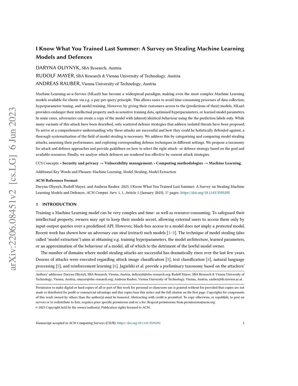 Machine Learning-as-a-Service (MLaaS) has become a widespread paradigm, making even the most complex machine learning models available for clients via e.g. a pay-per-query principle. This allows users to avoid time-consuming processes of data collection, hyperparameter tuning, and model training. However, by giving their customers access to the (predictions of their) models, MLaaS providers endanger their intellectual property, such as sensitive training data, optimised hyperparameters, or learned model parameters. Adversaries can create a copy of the model with (almost) identical behavior using the the prediction labels only. While many variants of this attack have been described, only scattered defence strategies have been proposed, addressing isolated threats. This raises the necessity for a thorough systematisation of the field of model stealing, to arrive at a comprehensive understanding why these attacks are successful, and how they could be holistically defended against. We address this by categorising and comparing model stealing attacks, assessing their performance, and exploring corresponding defence techniques in different settings. We propose a taxonomy for attack and defence approaches, and provide guidelines on how to select the right attack or defence strategy based on the goal and available resources. Finally, we analyse which defences are rendered less effective by current attack strategies.