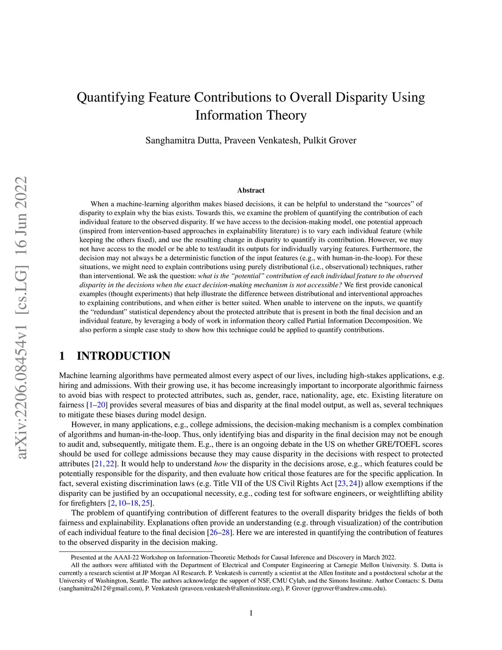 When a machine-learning algorithm makes biased decisions, it can be helpful to understand the sources of disparity to explain why the bias exists. Towards this, we examine the problem of quantifying the contribution of each individual feature to the observed disparity. If we have access to the decision-making model, one potential approach (inspired from intervention-based approaches in explainability literature) is to vary each individual feature (while keeping the others fixed) and use the resulting change in disparity to quantify its contribution. However, we may not have access to the model or be able to test/audit its outputs for individually varying features. Furthermore, the decision may not always be a deterministic function of the input features (e.g., with human-in-the-loop). For these situations, we might need to explain contributions using purely distributional (i.e., observational) techniques, rather than interventional. We ask the question: what is the "potential" contribution of each individual feature to the observed disparity in the decisions when the exact decision-making mechanism is not accessible? We first provide canonical examples (thought experiments) that help illustrate the difference between distributional and interventional approaches to explaining contributions, and when either is better suited. When unable to intervene on the inputs, we quantify the "redundant" statistical dependency about the protected attribute that is present in both the final decision and an individual feature, by leveraging a body of work in information theory called Partial Information Decomposition. We also perform a simple case study to show how this technique could be applied to quantify contributions.