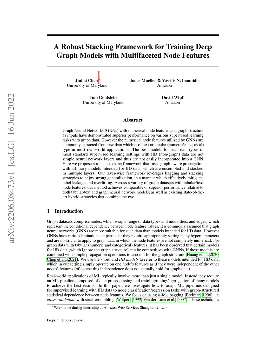 Graph Neural Networks (GNNs) with numerical node features and graph structure as inputs have demonstrated superior performance on various supervised learning tasks with graph data. However the numerical node features utilized by GNNs are commonly extracted from raw data which is of text or tabular (numeric/categorical) type in most real-world applications. The best models for such data types in most standard supervised learning settings with IID (non-graph) data are not simple neural network layers and thus are not easily incorporated into a GNN. Here we propose a robust stacking framework that fuses graph-aware propagation with arbitrary models intended for IID data, which are ensembled and stacked in multiple layers. Our layer-wise framework leverages bagging and stacking strategies to enjoy strong generalization, in a manner which effectively mitigates label leakage and overfitting. Across a variety of graph datasets with tabular/text node features, our method achieves comparable or superior performance relative to both tabular/text and graph neural network models, as well as existing state-of-the-art hybrid strategies that combine the two.