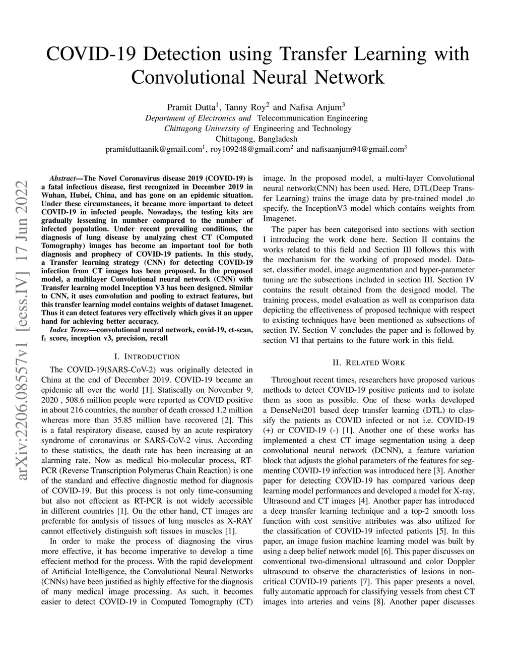 The Novel Coronavirus disease 2019 (COVID-19) is a fatal infectious disease, first recognized in December 2019 in Wuhan, Hubei, China, and has gone on an epidemic situation. Under these circumstances, it became more important to detect COVID-19 in infected people. Nowadays, the testing kits are gradually lessening in number compared to the number of infected population. Under recent prevailing conditions, the diagnosis of lung disease by analyzing chest CT (Computed Tomography) images has become an important tool for both diagnosis and prophecy of COVID-19 patients. In this study, a Transfer learning strategy (CNN) for detecting COVID-19 infection from CT images has been proposed. In the proposed model, a multilayer Convolutional neural network (CNN) with Transfer learning model Inception V3 has been designed. Similar to CNN, it uses convolution and pooling to extract features, but this transfer learning model contains weights of dataset Imagenet. Thus it can detect features very effectively which gives it an upper hand for achieving better accuracy.