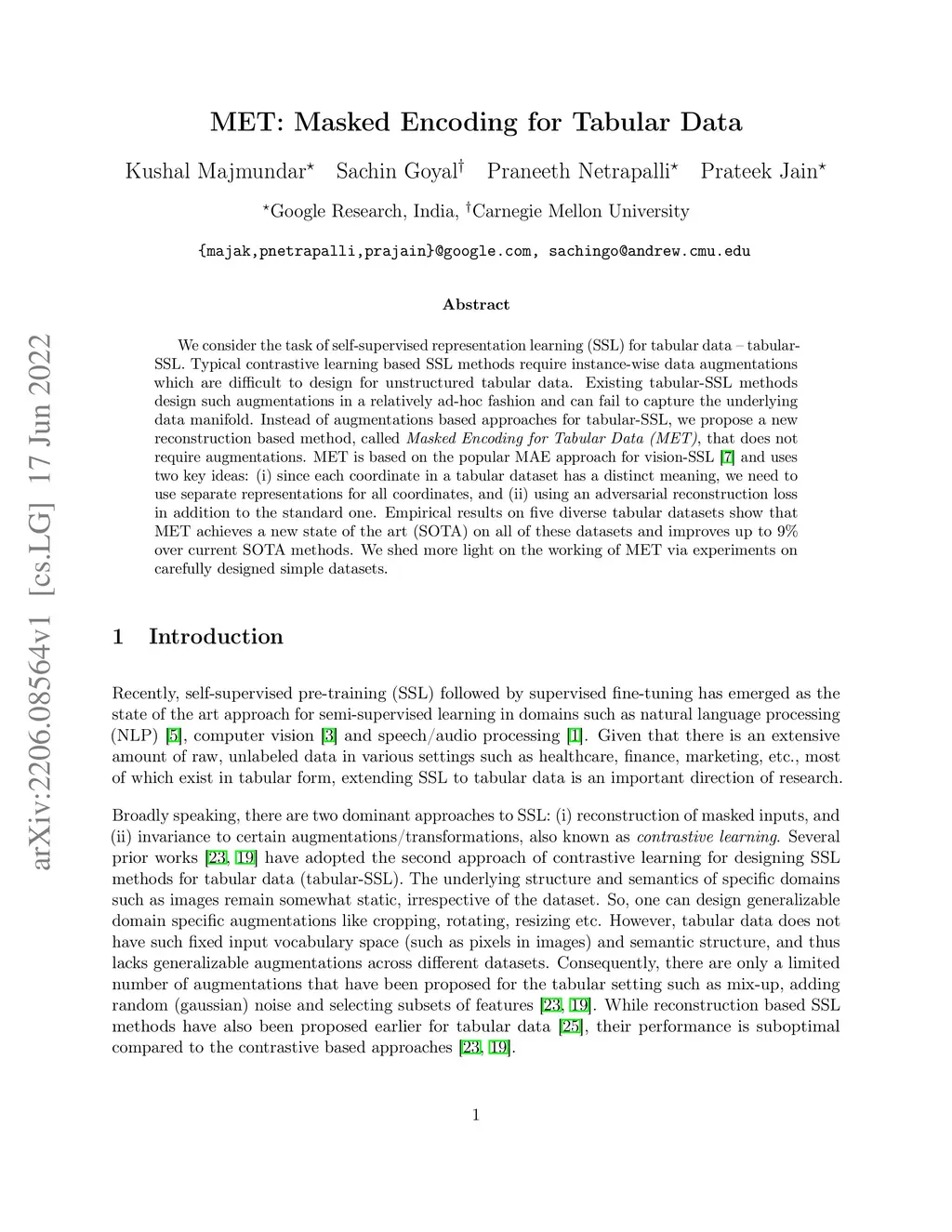 We consider the task of self-supervised representation learning (SSL) for tabular data: tabular-SSL. Typical contrastive learning based SSL methods require instance-wise data augmentations which are difficult to design for unstructured tabular data. Existing tabular-SSL methods design such augmentations in a relatively ad-hoc fashion and can fail to capture the underlying data manifold. Instead of augmentations based approaches for tabular-SSL, we propose a new reconstruction based method, called Masked Encoding for Tabular Data (MET), that does not require augmentations. MET is based on the popular MAE approach for vision-SSL [He et al., 2021] and uses two key ideas: (i) since each coordinate in a tabular dataset has a distinct meaning, we need to use separate representations for all coordinates, and (ii) using an adversarial reconstruction loss in addition to the standard one. Empirical results on five diverse tabular datasets show that MET achieves a new state of the art (SOTA) on all of these datasets and improves up to 9% over current SOTA methods. We shed more light on the working of MET via experiments on carefully designed simple datasets.