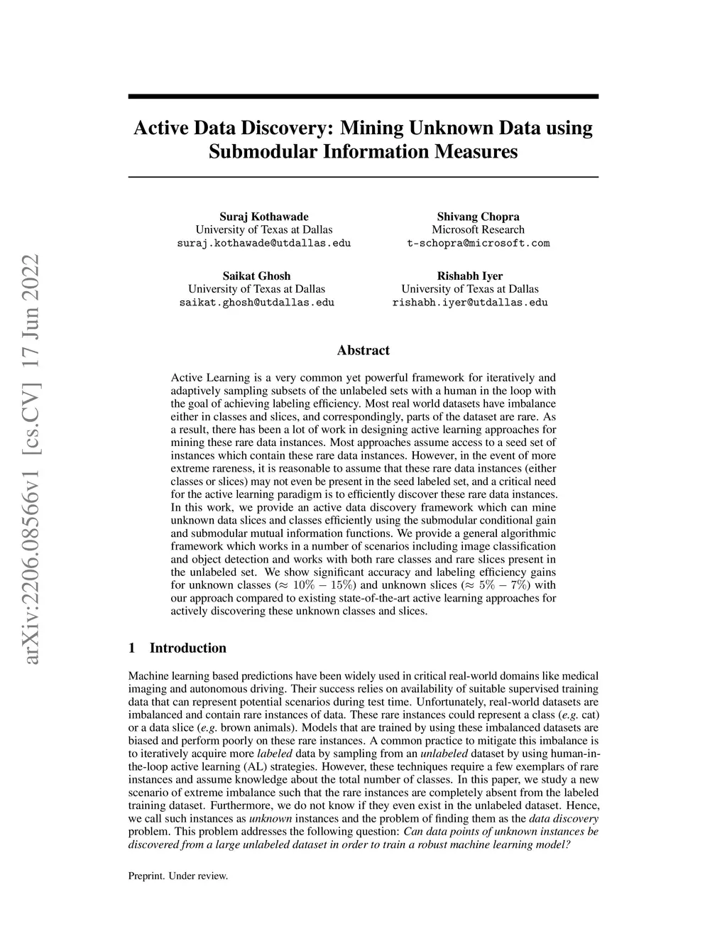 Active Learning is a very common yet powerful framework for iteratively and adaptively sampling subsets of the unlabeled sets with a human in the loop with the goal of achieving labeling efficiency. Most real world datasets have imbalance either in classes and slices, and correspondingly, parts of the dataset are rare. As a result, there has been a lot of work in designing active learning approaches for mining these rare data instances. Most approaches assume access to a seed set of instances which contain these rare data instances. However, in the event of more extreme rareness, it is reasonable to assume that these rare data instances (either classes or slices) may not even be present in the seed labeled set, and a critical need for the active learning paradigm is to efficiently discover these rare data instances. In this work, we provide an active data discovery framework which can mine unknown data slices and classes efficiently using the submodular conditional gain and submodular conditional mutual information functions. We provide a general algorithmic framework which works in a number of scenarios including image classification and object detection and works with both rare classes and rare slices present in the unlabeled set. We show significant accuracy and labeling efficiency gains with our approach compared to existing state-of-the-art active learning approaches for actively discovering these rare classes and slices.