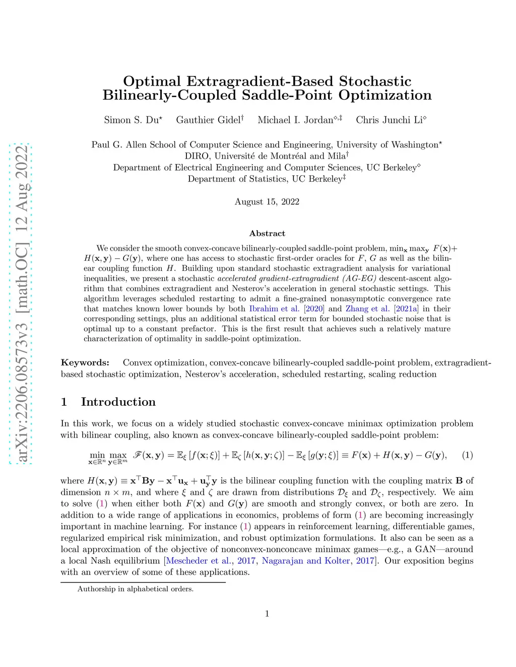 We consider the smooth convex-concave bilinearly-coupled saddle-point problem, , where one has access to stochastic first-order oracles for , as well as the bilinear coupling function . Building upon standard stochastic extragradient analysis for variational inequalities, we present a stochastic \emph{accelerated gradient-extragradient (AG-EG)} descent-ascent algorithm that combines extragradient and Nesterov's acceleration in general stochastic settings. This algorithm leverages scheduled restarting to admit a fine-grained nonasymptotic convergence rate that matches known lower bounds by both \citet{ibrahim2020linear} and \citet{zhang2021lower} in their corresponding settings, plus an additional statistical error term for bounded stochastic noise that is optimal up to a constant prefactor. This is the first result that achieves such a relatively mature characterization of optimality in saddle-point optimization.