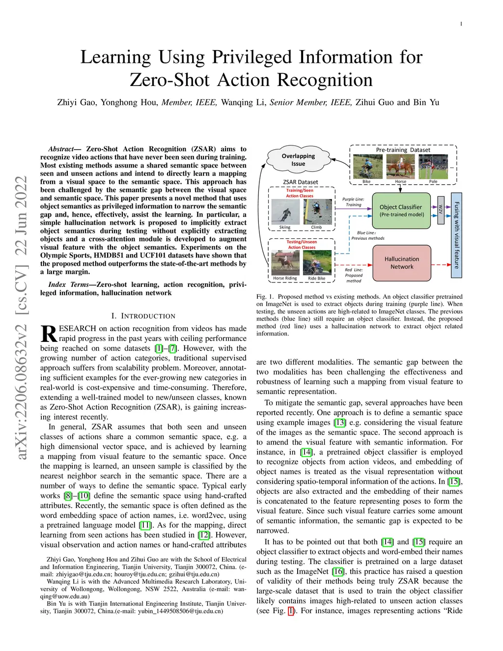 Zero-Shot Action Recognition (ZSAR) aims to recognize video actions that have never been seen during training. Most existing methods assume a shared semantic space between seen and unseen actions and intend to directly learn a mapping from a visual space to the semantic space. This approach has been challenged by the semantic gap between the visual space and semantic space. This paper presents a novel method that uses object semantics as privileged information to narrow the semantic gap and, hence, effectively, assist the learning. In particular, a simple hallucination network is proposed to implicitly extract object semantics during testing without explicitly extracting objects and a cross-attention module is developed to augment visual feature with the object semantics. Experiments on the Olympic Sports, HMDB51 and UCF101 datasets have shown that the proposed method outperforms the state-of-the-art methods by a large margin.