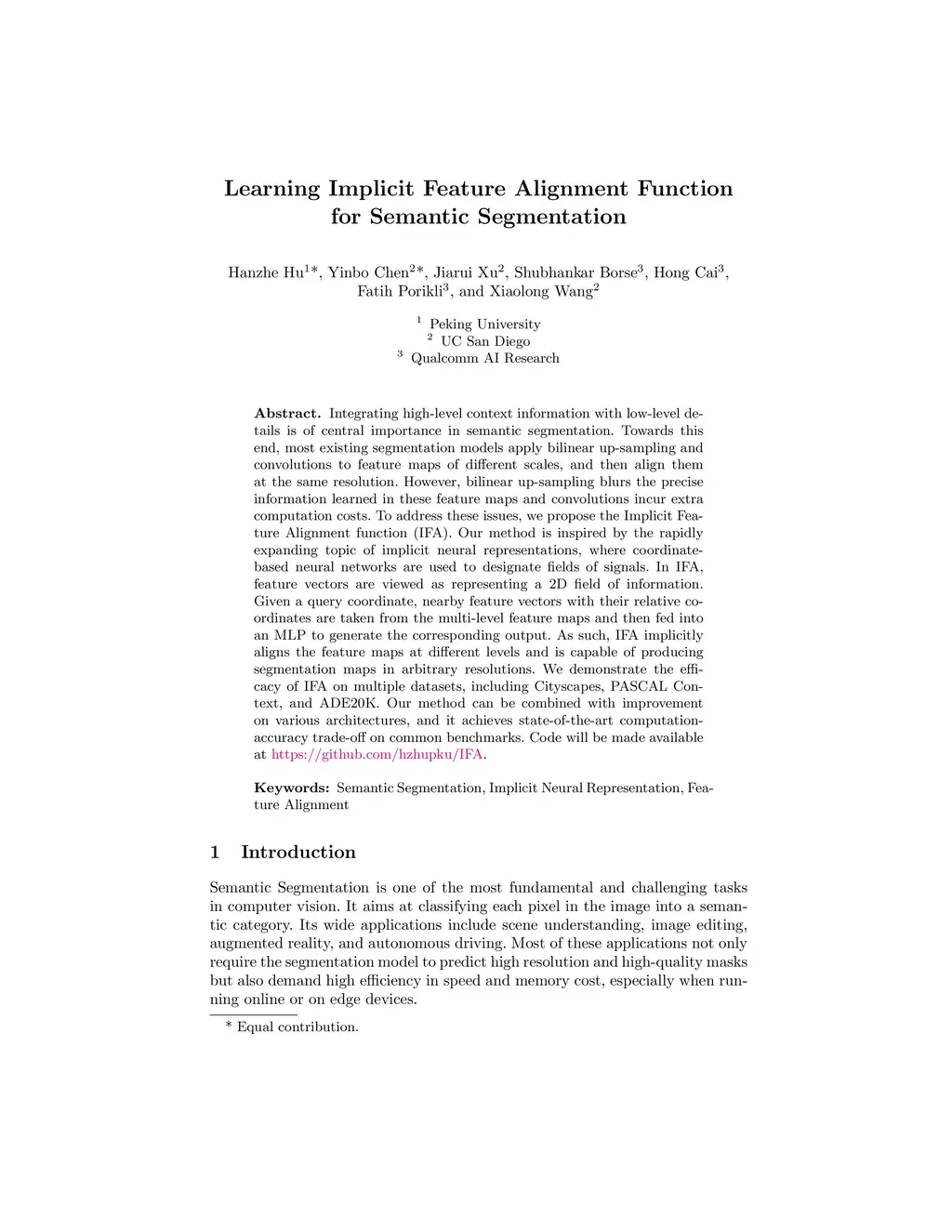 Learning Implicit Feature Alignment Function for Semantic Segmentation