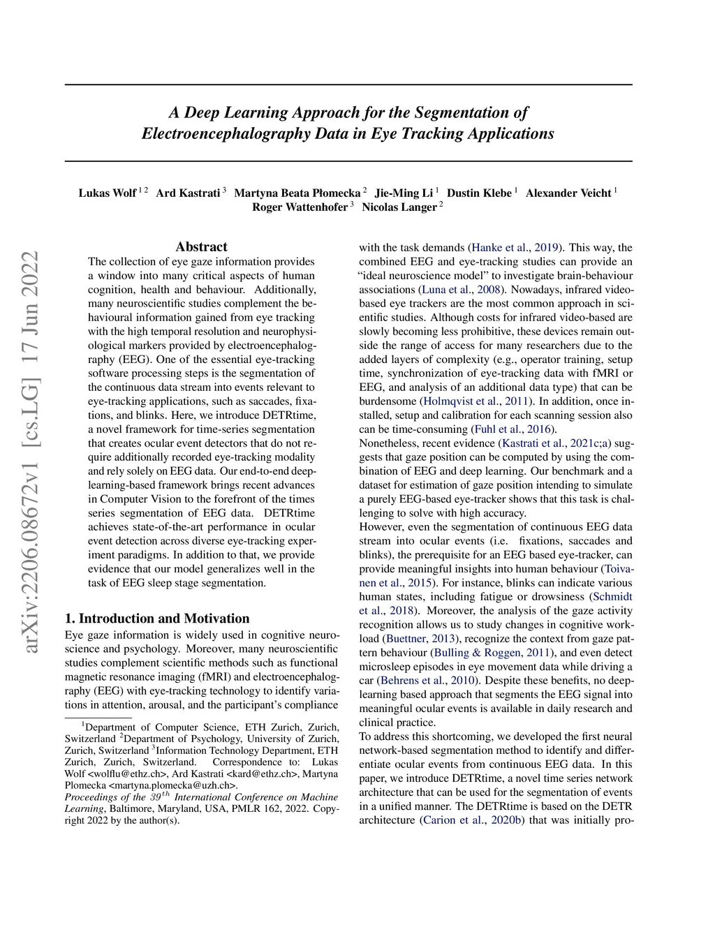 The collection of eye gaze information provides a window into many critical aspects of human cognition, health and behaviour. Additionally, many neuroscientific studies complement the behavioural information gained from eye tracking with the high temporal resolution and neurophysiological markers provided by electroencephalography (EEG). One of the essential eye-tracking software processing steps is the segmentation of the continuous data stream into events relevant to eye-tracking applications, such as saccades, fixations, and blinks. Here, we introduce DETRtime, a novel framework for time-series segmentation that creates ocular event detectors that do not require additionally recorded eye-tracking modality and rely solely on EEG data. Our end-to-end deep learning-based framework brings recent advances in Computer Vision to the forefront of the times series segmentation of EEG data. DETRtime achieves state-of-the-art performance in ocular event detection across diverse eye-tracking experiment paradigms. In addition to that, we provide evidence that our model generalizes well in the task of EEG sleep stage segmentation.