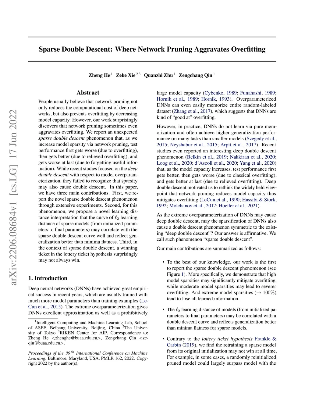 People usually believe that network pruning not only reduces the computational cost of deep networks, but also prevents overfitting by decreasing model capacity. However, our work surprisingly discovers that network pruning sometimes even aggravates overfitting. We report an unexpected sparse double descent phenomenon that, as we increase model sparsity via network pruning, test performance first gets worse (due to overfitting), then gets better (due to relieved overfitting), and gets worse at last (due to forgetting useful information). While recent studies focused on the deep double descent with respect to model overparameterization, they failed to recognize that sparsity may also cause double descent. In this paper, we have three main contributions. First, we report the novel sparse double descent phenomenon through extensive experiments. Second, for this phenomenon, we propose a novel learning distance interpretation that the curve of learning distance of sparse models (from initialized parameters to final parameters) may correlate with the sparse double descent curve well and reflect generalization better than minima flatness. Third, in the context of sparse double descent, a winning ticket in the lottery ticket hypothesis surprisingly may not always win.