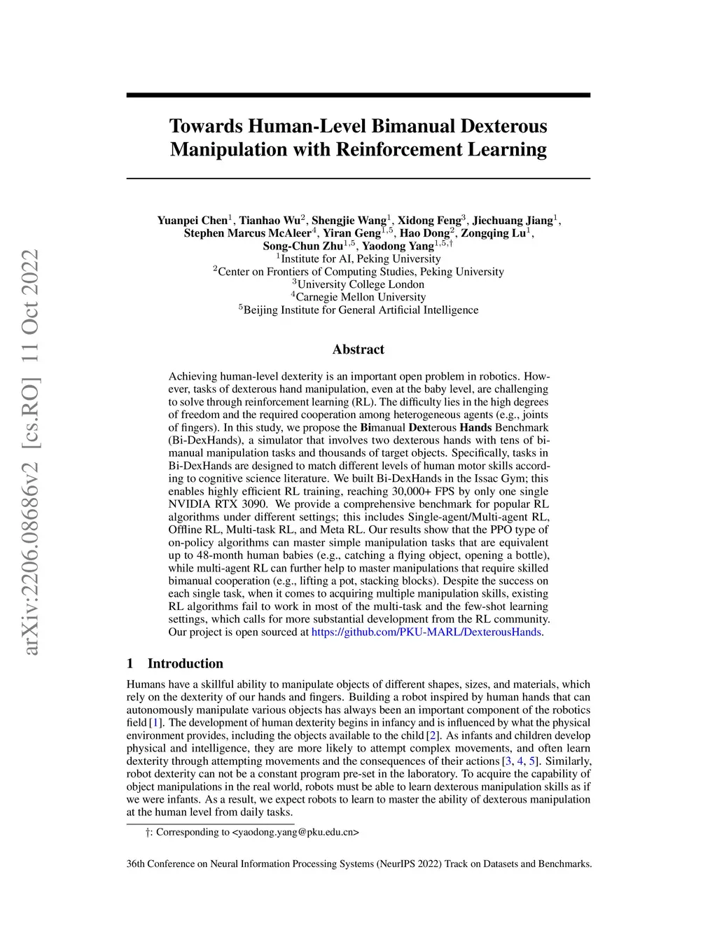 Achieving human-level dexterity is an important open problem in robotics. However, tasks of dexterous hand manipulation, even at the baby level, are challenging to solve through reinforcement learning (RL). The difficulty lies in the high degrees of freedom and the required cooperation among heterogeneous agents (e.g., joints of fingers). In this study, we propose the Bimanual Dexterous Hands Benchmark (Bi-DexHands), a simulator that involves two dexterous hands with tens of bimanual manipulation tasks and thousands of target objects. Specifically, tasks in Bi-DexHands are designed to match different levels of human motor skills according to cognitive science literature. We built Bi-DexHands in the Issac Gym; this enables highly efficient RL training, reaching 30,000+ FPS by only one single NVIDIA RTX 3090. We provide a comprehensive benchmark for popular RL algorithms under different settings; this includes Single-agent/Multi-agent RL, Offline RL, Multi-task RL, and Meta RL. Our results show that the PPO type of on-policy algorithms can master simple manipulation tasks that are equivalent up to 48-month human babies (e.g., catching a flying object, opening a bottle), while multi-agent RL can further help to master manipulations that require skilled bimanual cooperation (e.g., lifting a pot, stacking blocks). Despite the success on each single task, when it comes to acquiring multiple manipulation skills, existing RL algorithms fail to work in most of the multi-task and the few-shot learning settings, which calls for more substantial development from the RL community. Our project is open sourced at https://github.com/PKU-MARL/DexterousHands.