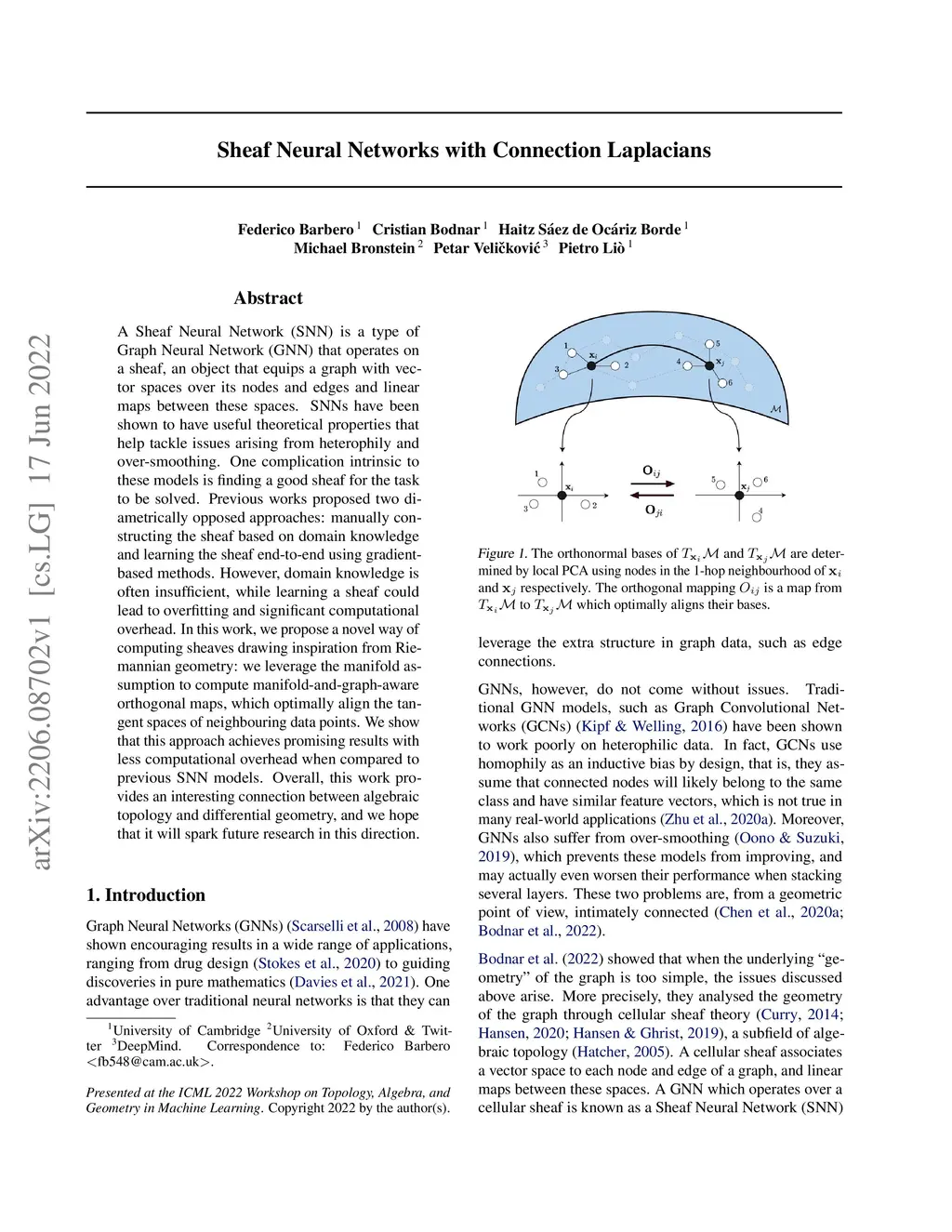A Sheaf Neural Network (SNN) is a type of Graph Neural Network (GNN) that operates on a sheaf, an object that equips a graph with vector spaces over its nodes and edges and linear maps between these spaces. SNNs have been shown to have useful theoretical properties that help tackle issues arising from heterophily and over-smoothing. One complication intrinsic to these models is finding a good sheaf for the task to be solved. Previous works proposed two diametrically opposed approaches: manually constructing the sheaf based on domain knowledge and learning the sheaf end-to-end using gradient-based methods. However, domain knowledge is often insufficient, while learning a sheaf could lead to overfitting and significant computational overhead. In this work, we propose a novel way of computing sheaves drawing inspiration from Riemannian geometry: we leverage the manifold assumption to compute manifold-and-graph-aware orthogonal maps, which optimally align the tangent spaces of neighbouring data points. We show that this approach achieves promising results with less computational overhead when compared to previous SNN models. Overall, this work provides an interesting connection between algebraic topology and differential geometry, and we hope that it will spark future research in this direction.