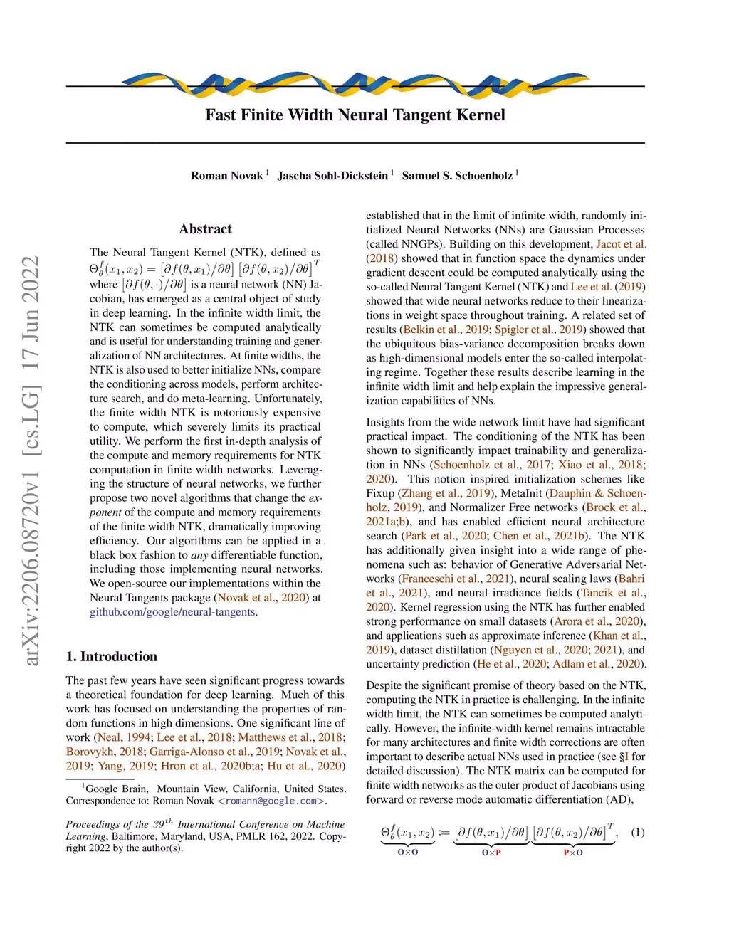 The Neural Tangent Kernel (NTK), defined as where is a neural network (NN) Jacobian, has emerged as a central object of study in deep learning. In the infinite width limit, the NTK can sometimes be computed analytically and is useful for understanding training and generalization of NN architectures. At finite widths, the NTK is also used to better initialize NNs, compare the conditioning across models, perform architecture search, and do meta-learning. Unfortunately, the finite width NTK is notoriously expensive to compute, which severely limits its practical utility. We perform the first in-depth analysis of the compute and memory requirements for NTK computation in finite width networks. Leveraging the structure of neural networks, we further propose two novel algorithms that change the exponent of the compute and memory requirements of the finite width NTK, dramatically improving efficiency. Our algorithms can be applied in a black box fashion to any differentiable function, including those implementing neural networks. We open-source our implementations within the Neural Tangents package (arXiv:1912.02803) at https://github.com/google/neural-tangents.