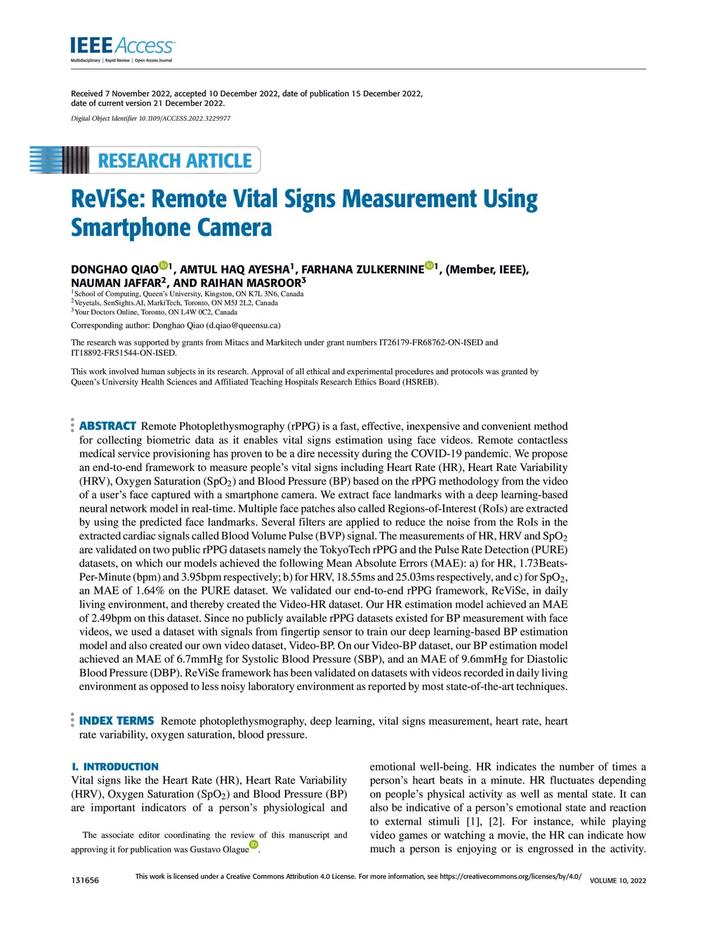 ReViSe: Remote Vital Signs Measurement Using Smartphone Camera