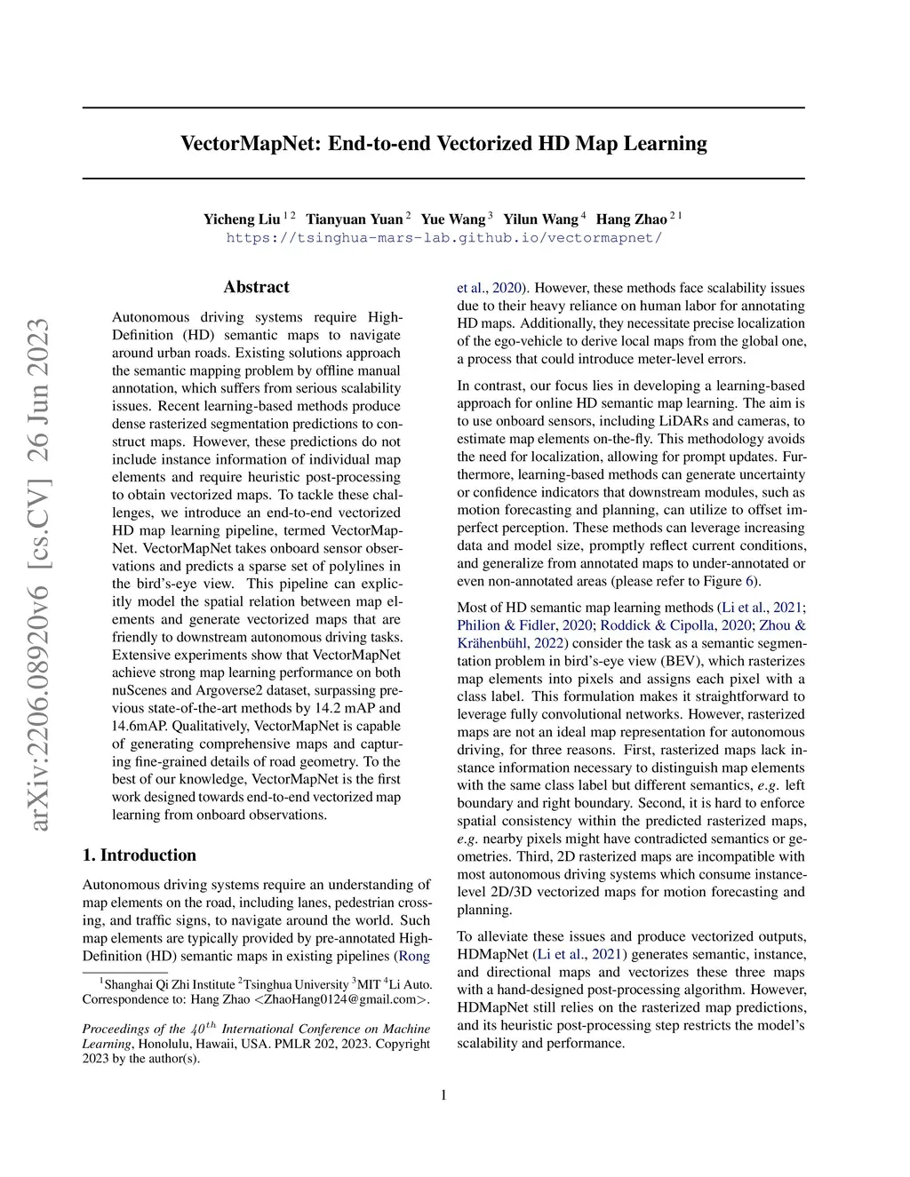 VectorMapNet: End-to-end Vectorized HD Map Learning