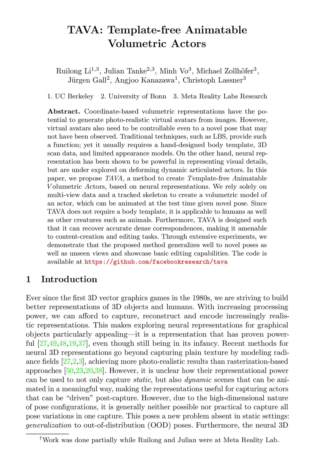 TAVA: Template-free Animatable Volumetric Actors