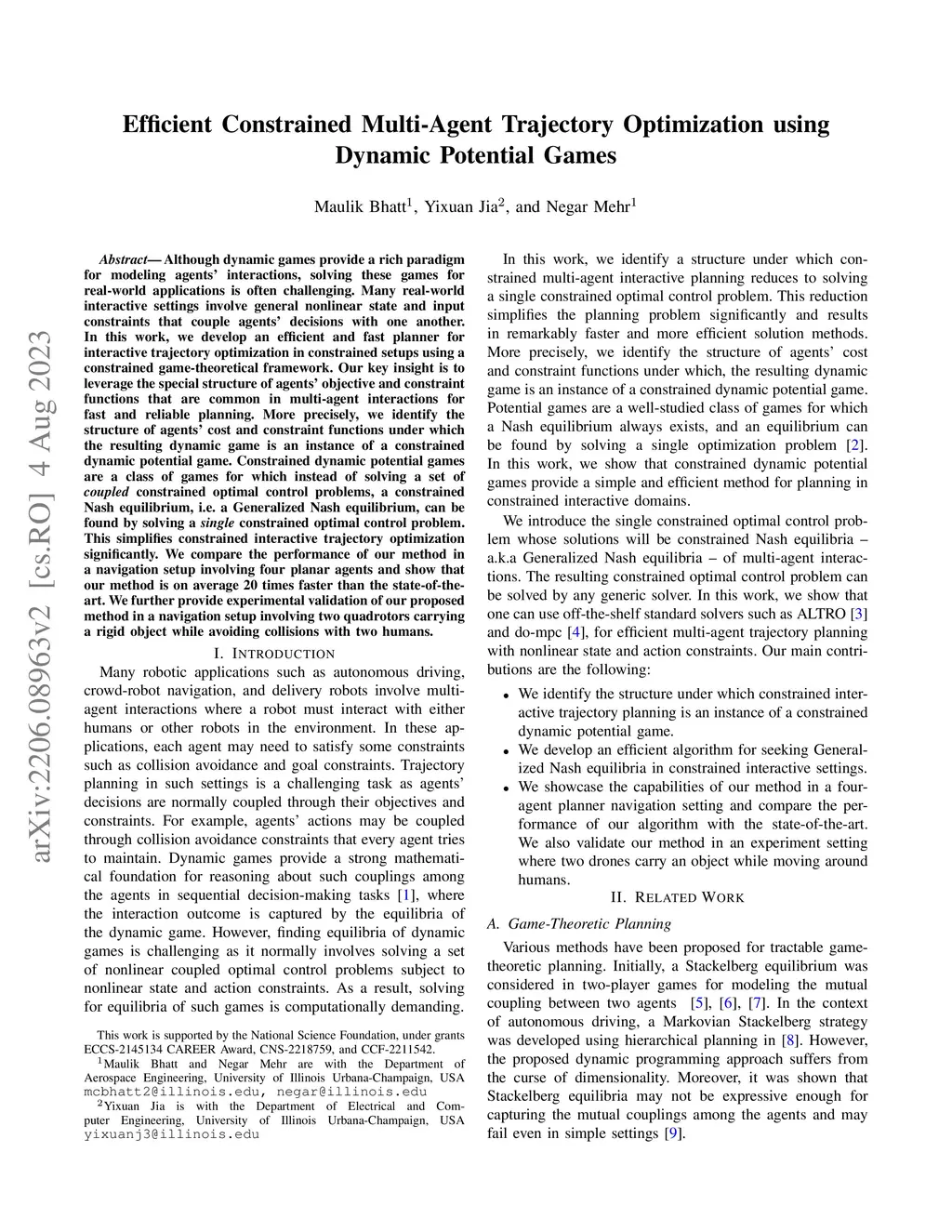 Although dynamic games provide a rich paradigm for modeling agents' interactions, solving these games for real-world applications is often challenging. Many real-world interactive settings involve general nonlinear state and input constraints that couple agents' decisions with one another. In this work, we develop an efficient and fast planner for interactive trajectory optimization in constrained setups using a constrained game-theoretical framework. Our key insight is to leverage the special structure of agents' objective and constraint functions that are common in multi-agent interactions for fast and reliable planning. More precisely, we identify the structure of agents' cost and constraint functions under which the resulting dynamic game is an instance of a constrained dynamic potential game. Constrained dynamic potential games are a class of games for which instead of solving a set of coupled constrained optimal control problems, a constrained Nash equilibrium, i.e. a Generalized Nash equilibrium, can be found by solving a single constrained optimal control problem. This simplifies constrained interactive trajectory optimization significantly. We compare the performance of our method in a navigation setup involving four planar agents and show that our method is on average 20 times faster than the state-of-the-art. We further provide experimental validation of our proposed method in a navigation setup involving two quadrotors carrying a rigid object while avoiding collisions with two humans.