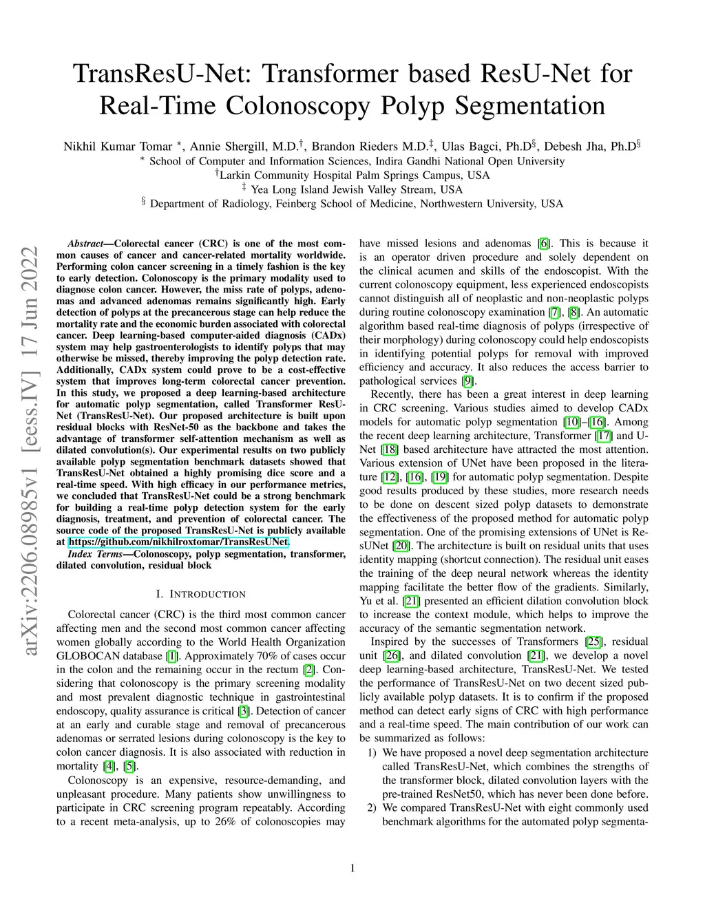 TransResU-Net: Transformer based ResU-Net for Real-Time Colonoscopy