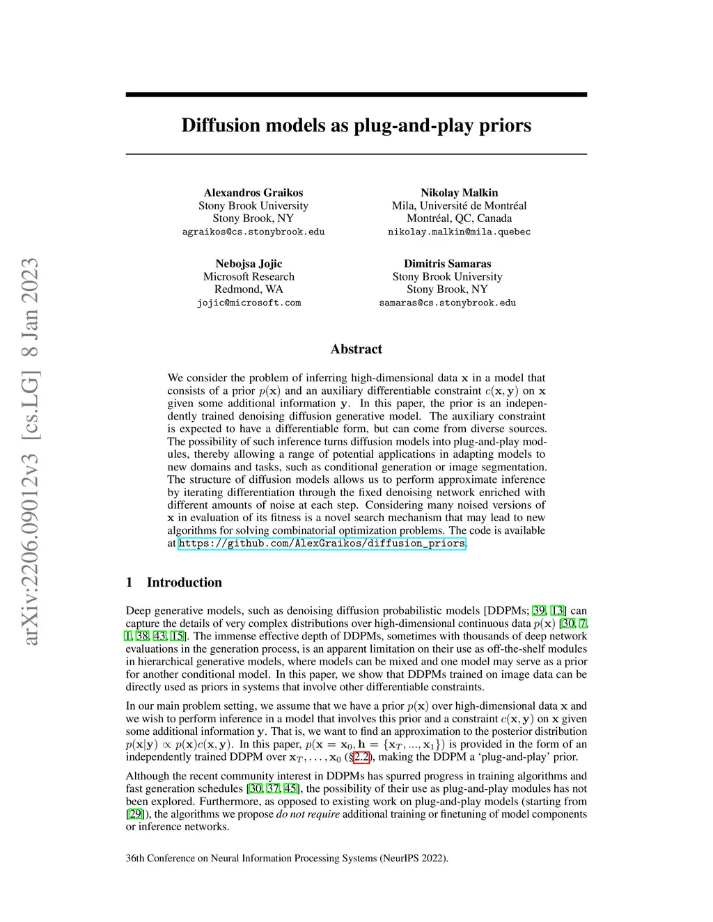 We consider the problem of inferring high-dimensional data in a model that consists of a prior and an auxiliary differentiable constraint on given some additional information . In this paper, the prior is an independently trained denoising diffusion generative model. The auxiliary constraint is expected to have a differentiable form, but can come from diverse sources. The possibility of such inference turns diffusion models into plug-and-play modules, thereby allowing a range of potential applications in adapting models to new domains and tasks, such as conditional generation or image segmentation. The structure of diffusion models allows us to perform approximate inference by iterating differentiation through the fixed denoising network enriched with different amounts of noise at each step. Considering many noised versions of in evaluation of its fitness is a novel search mechanism that may lead to new algorithms for solving combinatorial optimization problems.