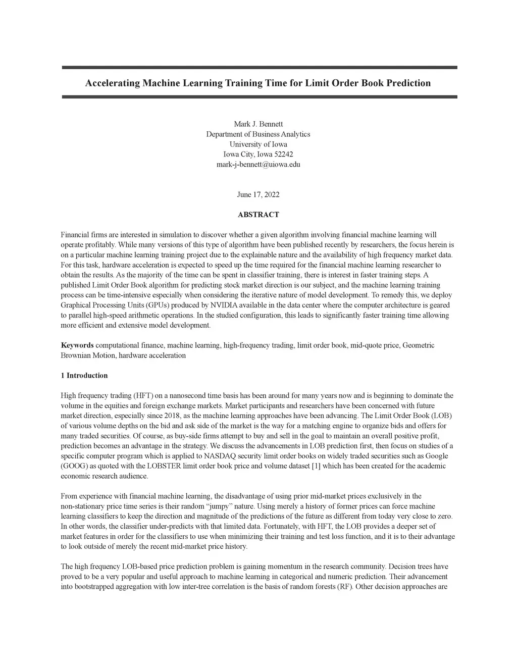 Financial firms are interested in simulation to discover whether a given algorithm involving financial machine learning will operate profitably. While many versions of this type of algorithm have been published recently by researchers, the focus herein is on a particular machine learning training project due to the explainable nature and the availability of high frequency market data. For this task, hardware acceleration is expected to speed up the time required for the financial machine learning researcher to obtain the results. As the majority of the time can be spent in classifier training, there is interest in faster training steps. A published Limit Order Book algorithm for predicting stock market direction is our subject, and the machine learning training process can be time-intensive especially when considering the iterative nature of model development. To remedy this, we deploy Graphical Processing Units (GPUs) produced by NVIDIA available in the data center where the computer architecture is geared to parallel high-speed arithmetic operations. In the studied configuration, this leads to significantly faster training time allowing more efficient and extensive model development.