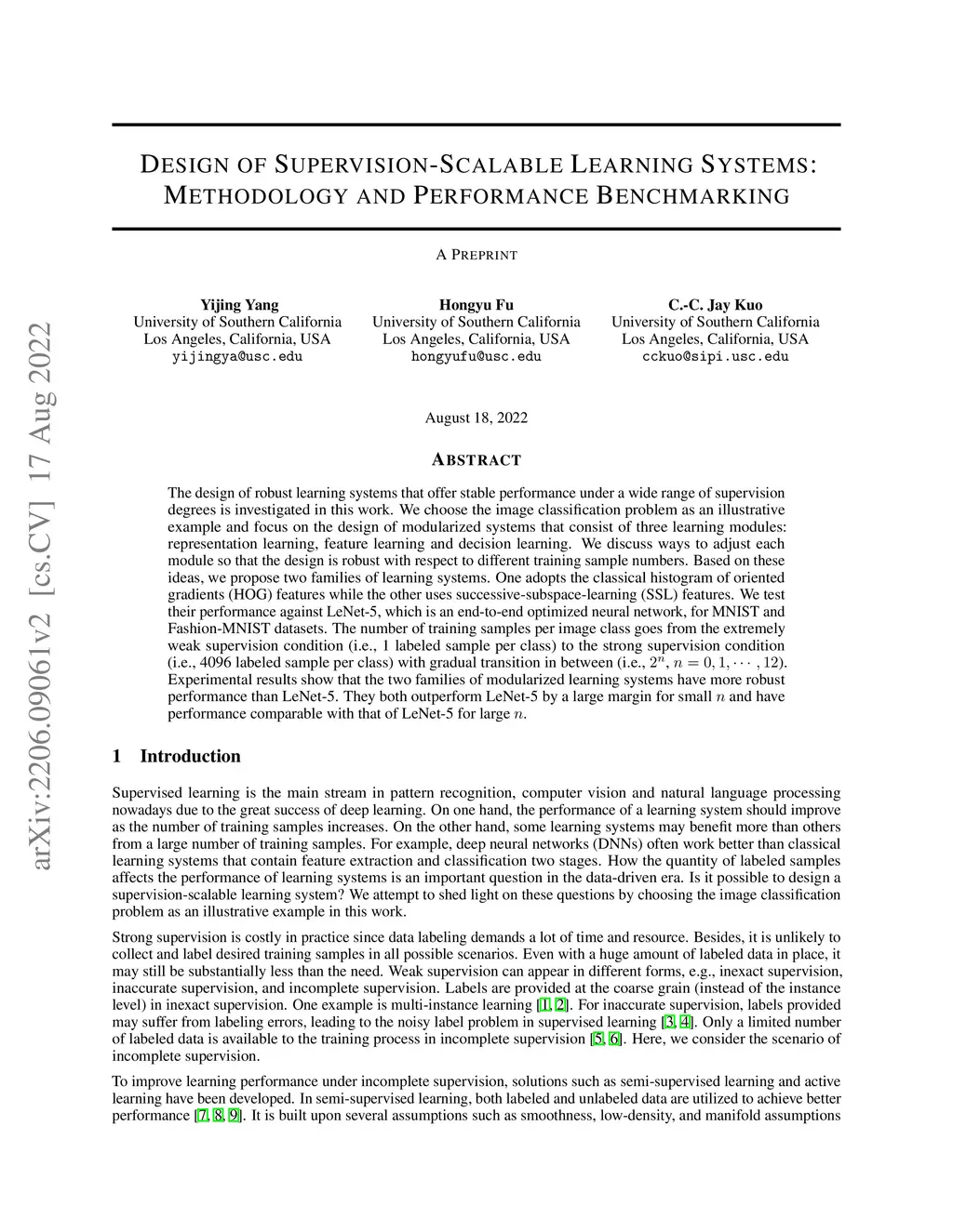 The design of robust learning systems that offer stable performance under a wide range of supervision degrees is investigated in this work. We choose the image classification problem as an illustrative example and focus on the design of modularized systems that consist of three learning modules: representation learning, feature learning and decision learning. We discuss ways to adjust each module so that the design is robust with respect to different training sample numbers. Based on these ideas, we propose two families of learning systems. One adopts the classical histogram of oriented gradients (HOG) features while the other uses successive-subspace-learning (SSL) features. We test their performance against LeNet-5, which is an end-to-end optimized neural network, for MNIST and Fashion-MNIST datasets. The number of training samples per image class goes from the extremely weak supervision condition (i.e., 1 labeled sample per class) to the strong supervision condition (i.e., 4096 labeled sample per class) with gradual transition in between (i.e., , ). Experimental results show that the two families of modularized learning systems have more robust performance than LeNet-5. They both outperform LeNet-5 by a large margin for small and have performance comparable with that of LeNet-5 for large .