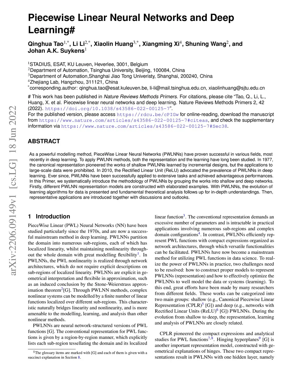 As a powerful modelling method, PieceWise Linear Neural Networks (PWLNNs) have proven successful in various fields, most recently in deep learning. To apply PWLNN methods, both the representation and the learning have long been studied. In 1977, the canonical representation pioneered the works of shallow PWLNNs learned by incremental designs, but the applications to large-scale data were prohibited. In 2010, the Rectified Linear Unit (ReLU) advocated the prevalence of PWLNNs in deep learning. Ever since, PWLNNs have been successfully applied to extensive tasks and achieved advantageous performances. In this Primer, we systematically introduce the methodology of PWLNNs by grouping the works into shallow and deep networks. Firstly, different PWLNN representation models are constructed with elaborated examples. With PWLNNs, the evolution of learning algorithms for data is presented and fundamental theoretical analysis follows up for in-depth understandings. Then, representative applications are introduced together with discussions and outlooks.