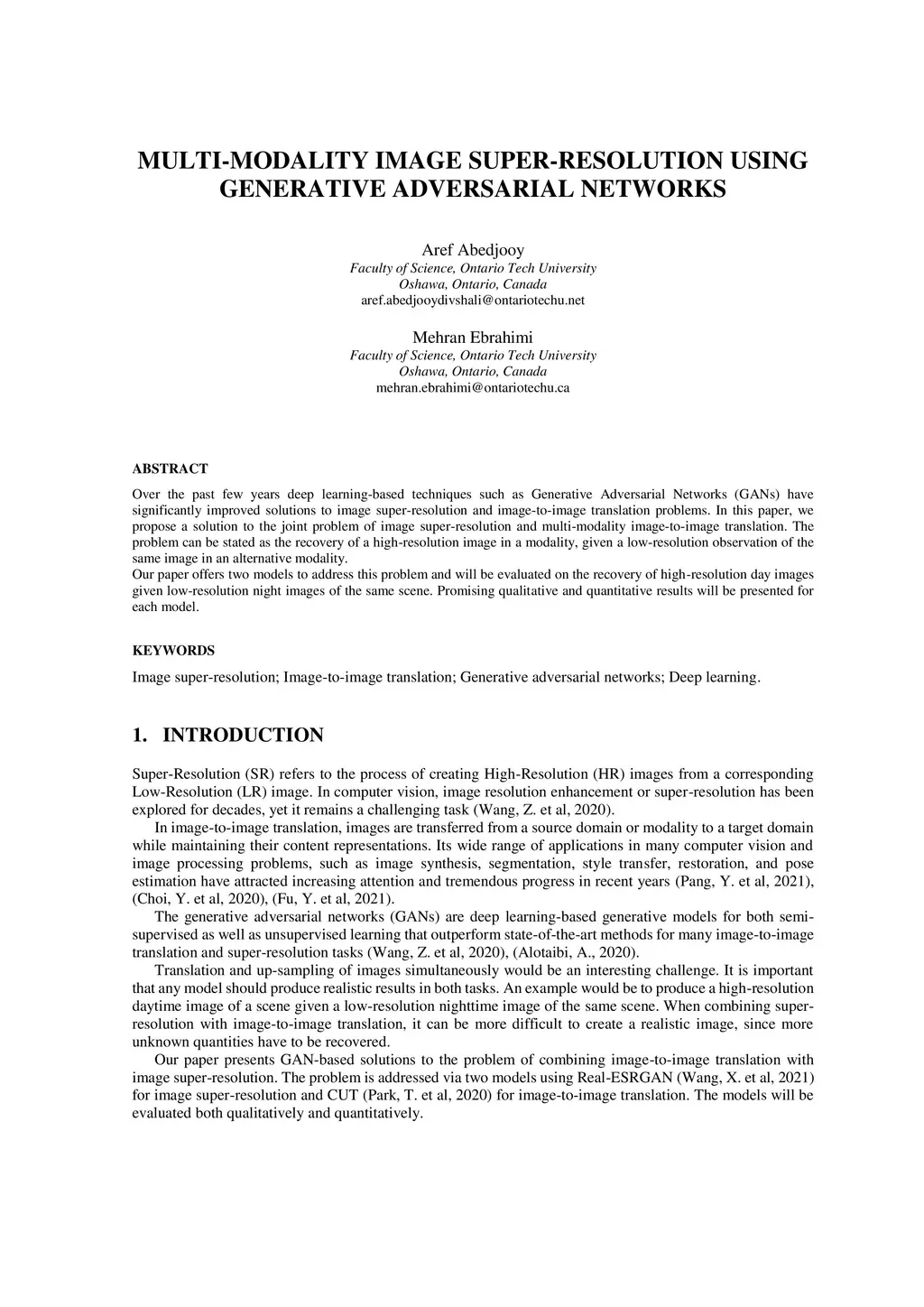 Over the past few years deep learning-based techniques such as Generative Adversarial Networks (GANs) have significantly improved solutions to image super-resolution and image-to-image translation problems. In this paper, we propose a solution to the joint problem of image super-resolution and multi-modality image-to-image translation. The problem can be stated as the recovery of a high-resolution image in a modality, given a low-resolution observation of the same image in an alternative modality. Our paper offers two models to address this problem and will be evaluated on the recovery of high-resolution day images given low-resolution night images of the same scene. Promising qualitative and quantitative results will be presented for each model.
