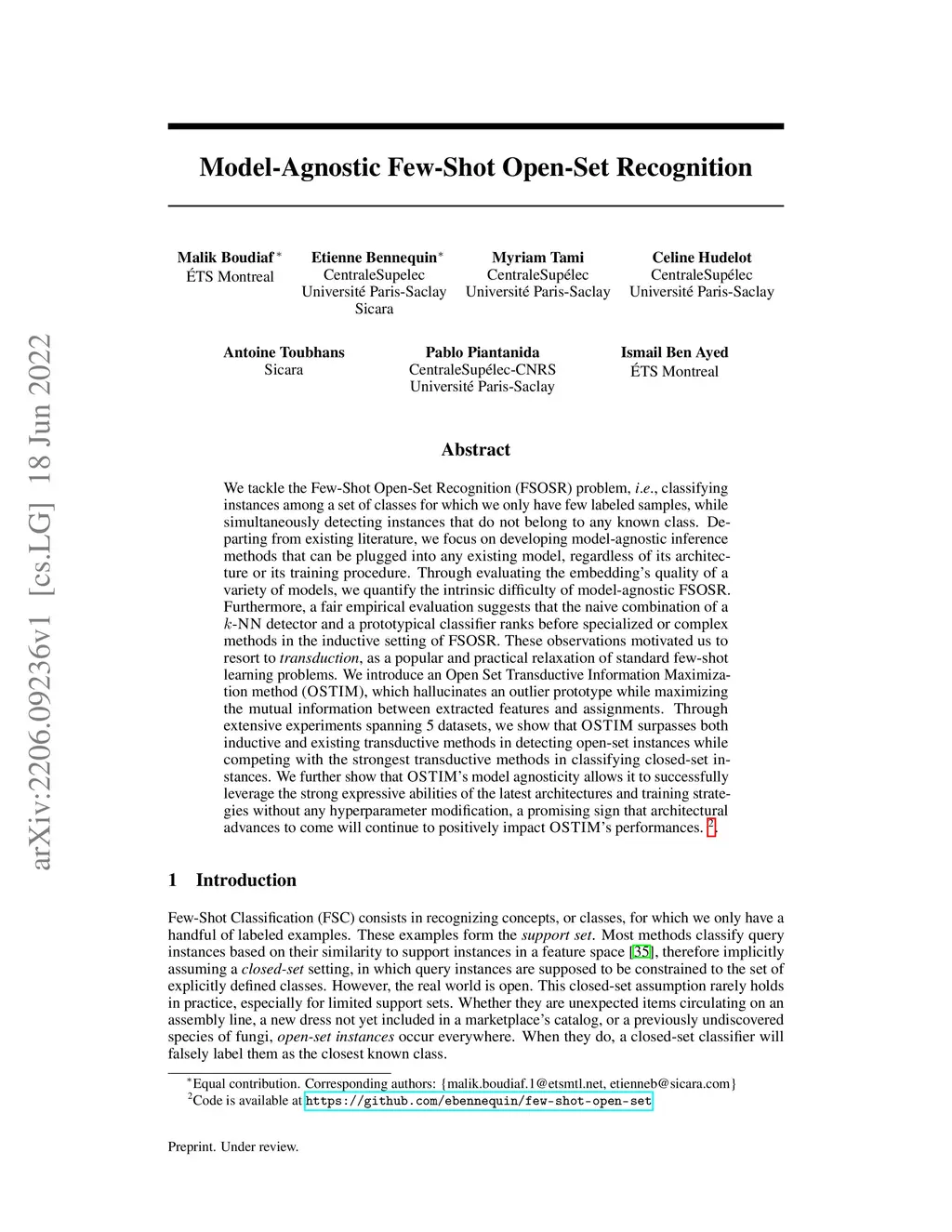 We tackle the Few-Shot Open-Set Recognition (FSOSR) problem, i.e. classifying instances among a set of classes for which we only have few labeled samples, while simultaneously detecting instances that do not belong to any known class. Departing from existing literature, we focus on developing model-agnostic inference methods that can be plugged into any existing model, regardless of its architecture or its training procedure. Through evaluating the embedding's quality of a variety of models, we quantify the intrinsic difficulty of model-agnostic FSOSR. Furthermore, a fair empirical evaluation suggests that the naive combination of a kNN detector and a prototypical classifier ranks before specialized or complex methods in the inductive setting of FSOSR. These observations motivated us to resort to transduction, as a popular and practical relaxation of standard few-shot learning problems. We introduce an Open Set Transductive Information Maximization method OSTIM, which hallucinates an outlier prototype while maximizing the mutual information between extracted features and assignments. Through extensive experiments spanning 5 datasets, we show that OSTIM surpasses both inductive and existing transductive methods in detecting open-set instances while competing with the strongest transductive methods in classifying closed-set instances. We further show that OSTIM's model agnosticity allows it to successfully leverage the strong expressive abilities of the latest architectures and training strategies without any hyperparameter modification, a promising sign that architectural advances to come will continue to positively impact OSTIM's performances.