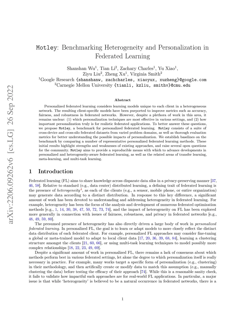 Personalized federated learning considers learning models unique to each client in a heterogeneous network. The resulting client-specific models have been purported to improve metrics such as accuracy, fairness, and robustness in federated networks. However, despite a plethora of work in this area, it remains unclear: (1) which personalization techniques are most effective in various settings, and (2) how important personalization truly is for realistic federated applications. To better answer these questions, we propose Motley, a benchmark for personalized federated learning. Motley consists of a suite of cross-device and cross-silo federated datasets from varied problem domains, as well as thorough evaluation metrics for better understanding the possible impacts of personalization. We establish baselines on the benchmark by comparing a number of representative personalized federated learning methods. These initial results highlight strengths and weaknesses of existing approaches, and raise several open questions for the community. Motley aims to provide a reproducible means with which to advance developments in personalized and heterogeneity-aware federated learning, as well as the related areas of transfer learning, meta-learning, and multi-task learning.