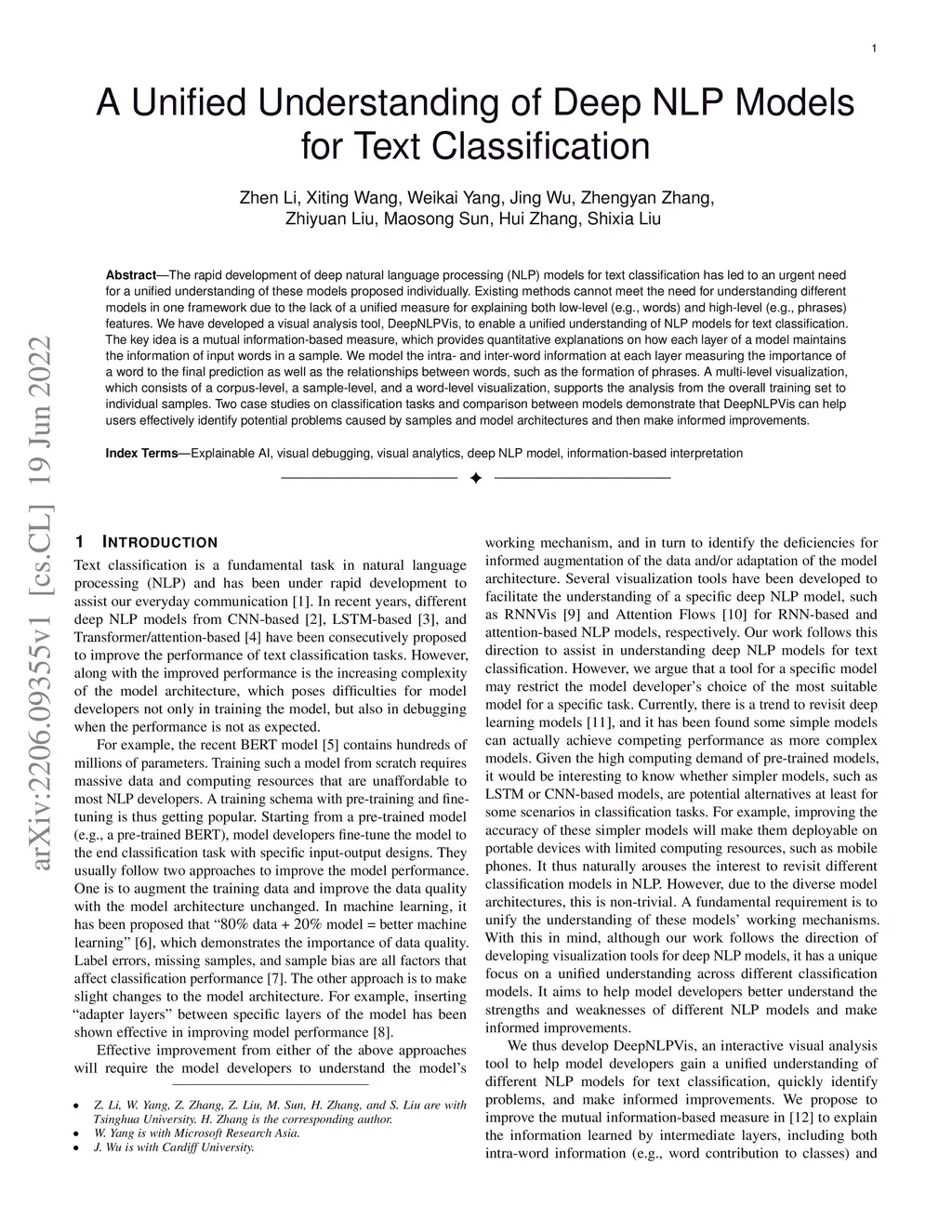 The rapid development of deep natural language processing (NLP) models for text classification has led to an urgent need for a unified understanding of these models proposed individually. Existing methods cannot meet the need for understanding different models in one framework due to the lack of a unified measure for explaining both low-level (e.g., words) and high-level (e.g., phrases) features. We have developed a visual analysis tool, DeepNLPVis, to enable a unified understanding of NLP models for text classification. The key idea is a mutual information-based measure, which provides quantitative explanations on how each layer of a model maintains the information of input words in a sample. We model the intra- and inter-word information at each layer measuring the importance of a word to the final prediction as well as the relationships between words, such as the formation of phrases. A multi-level visualization, which consists of a corpus-level, a sample-level, and a word-level visualization, supports the analysis from the overall training set to individual samples. Two case studies on classification tasks and comparison between models demonstrate that DeepNLPVis can help users effectively identify potential problems caused by samples and model architectures and then make informed improvements.