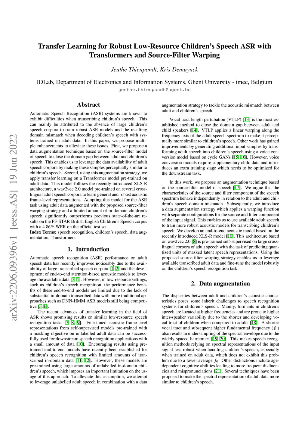 Automatic Speech Recognition (ASR) systems are known to exhibit difficulties when transcribing children's speech. This can mainly be attributed to the absence of large children's speech corpora to train robust ASR models and the resulting domain mismatch when decoding children's speech with systems trained on adult data. In this paper, we propose multiple enhancements to alleviate these issues. First, we propose a data augmentation technique based on the source-filter model of speech to close the domain gap between adult and children's speech. This enables us to leverage the data availability of adult speech corpora by making these samples perceptually similar to children's speech. Second, using this augmentation strategy, we apply transfer learning on a Transformer model pre-trained on adult data. This model follows the recently introduced XLS-R architecture, a wav2vec 2.0 model pre-trained on several cross-lingual adult speech corpora to learn general and robust acoustic frame-level representations. Adopting this model for the ASR task using adult data augmented with the proposed source-filter warping strategy and a limited amount of in-domain children's speech significantly outperforms previous state-of-the-art results on the PF-STAR British English Children's Speech corpus with a 4.86% WER on the official test set.