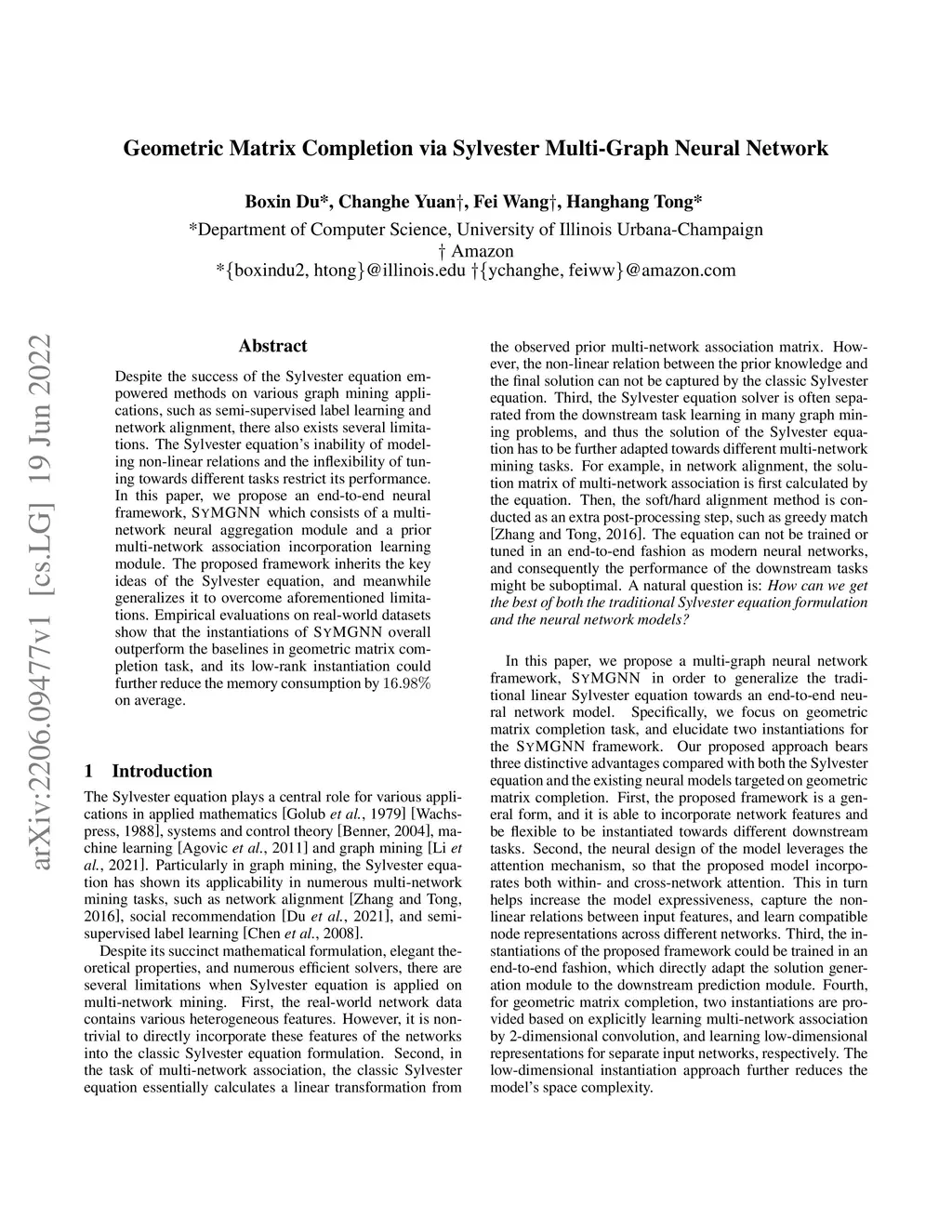 Despite the success of the Sylvester equation empowered methods on various graph mining applications, such as semi-supervised label learning and network alignment, there also exists several limitations. The Sylvester equation's inability of modeling non-linear relations and the inflexibility of tuning towards different tasks restrict its performance. In this paper, we propose an end-to-end neural framework, SYMGNN, which consists of a multi-network neural aggregation module and a prior multi-network association incorporation learning module. The proposed framework inherits the key ideas of the Sylvester equation, and meanwhile generalizes it to overcome aforementioned limitations. Empirical evaluations on real-world datasets show that the instantiations of SYMGNN overall outperform the baselines in geometric matrix completion task, and its low-rank instantiation could further reduce the memory consumption by 16.98\% on average.