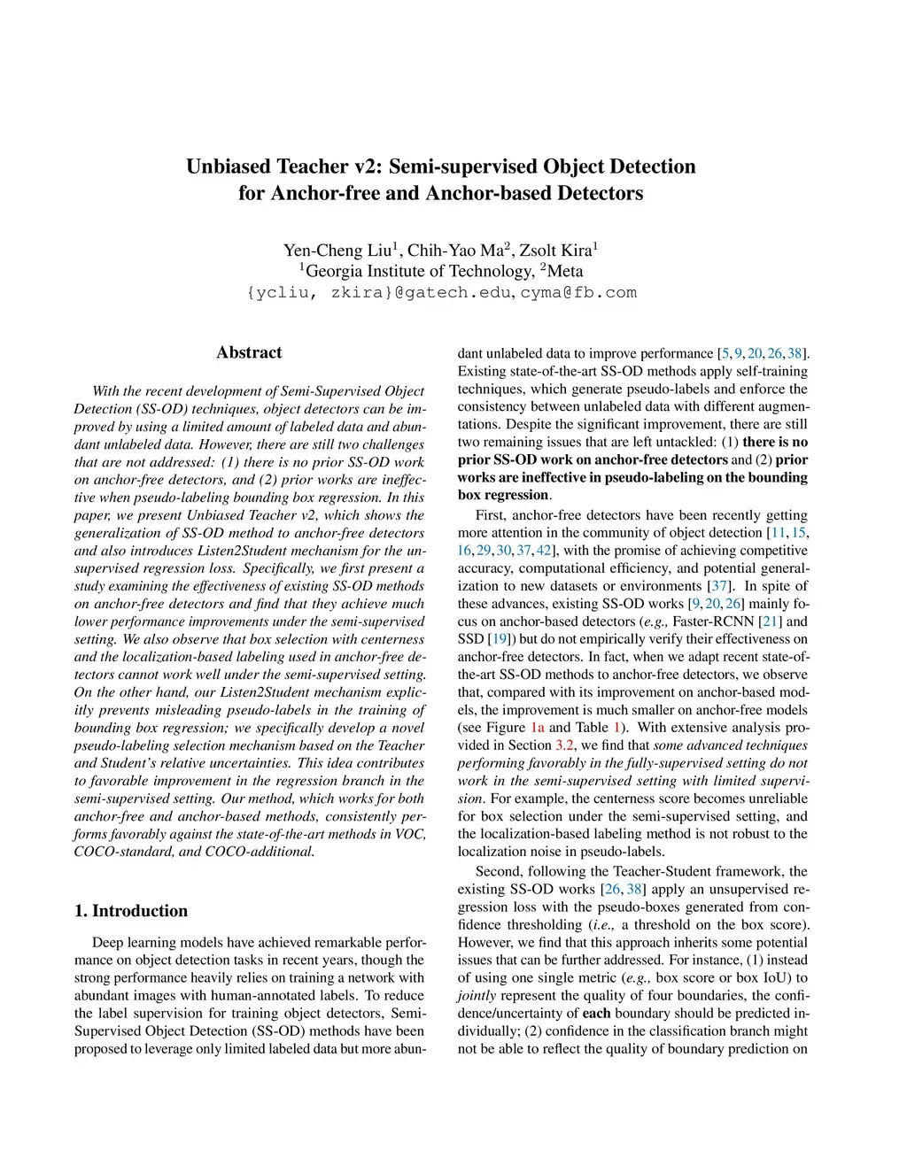 With the recent development of Semi-Supervised Object Detection (SS-OD) techniques, object detectors can be improved by using a limited amount of labeled data and abundant unlabeled data. However, there are still two challenges that are not addressed: (1) there is no prior SS-OD work on anchor-free detectors, and (2) prior works are ineffective when pseudo-labeling bounding box regression. In this paper, we present Unbiased Teacher v2, which shows the generalization of SS-OD method to anchor-free detectors and also introduces Listen2Student mechanism for the unsupervised regression loss. Specifically, we first present a study examining the effectiveness of existing SS-OD methods on anchor-free detectors and find that they achieve much lower performance improvements under the semi-supervised setting. We also observe that box selection with centerness and the localization-based labeling used in anchor-free detectors cannot work well under the semi-supervised setting. On the other hand, our Listen2Student mechanism explicitly prevents misleading pseudo-labels in the training of bounding box regression; we specifically develop a novel pseudo-labeling selection mechanism based on the Teacher and Student's relative uncertainties. This idea contributes to favorable improvement in the regression branch in the semi-supervised setting. Our method, which works for both anchor-free and anchor-based methods, consistently performs favorably against the state-of-the-art methods in VOC, COCO-standard, and COCO-additional.