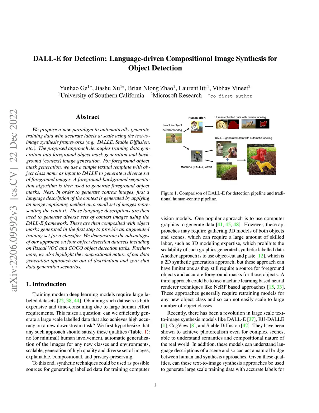 We propose a new paradigm to automatically generate training data with accurate labels at scale using the text-toimage synthesis frameworks (e.g., DALL-E, Stable Diffusion, etc.). The proposed approach decouples training data generation into foreground object mask generation and background (context) image generation. For foreground object mask generation, we use a simple textual template with object class name as input to DALL-E to generate a diverse set of foreground images. A foreground-background segmentation algorithm is then used to generate foreground object masks. Next, in order to generate context images, first a language description of the context is generated by applying an image captioning method on a small set of images representing the context. These language descriptions are then used to generate diverse sets of context images using the DALL-E framework. These are then composited with object masks generated in the first step to provide an augmented training set for a classifier. We demonstrate the advantages of our approach on four object detection datasets including on Pascal VOC and COCO object detection tasks. Furthermore, we also highlight the compositional nature of our data generation approach on out-of-distribution and zero-shot data generation scenarios.