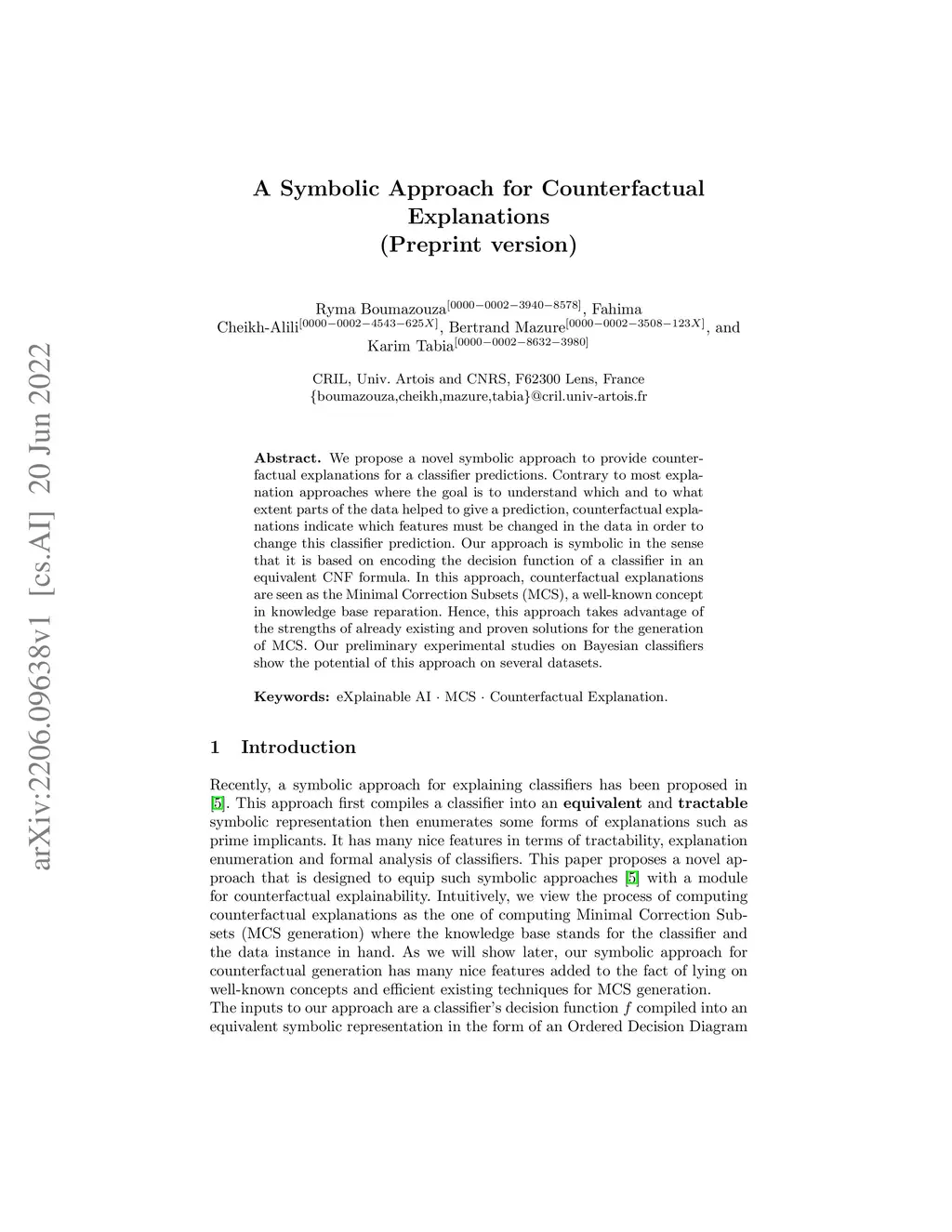 In this paper titled A Symbolic Approach for Counterfactual Explanations we propose a novel symbolic approach to provide counterfactual explanations for a classifier predictions. Contrary to most explanation approaches where the goal is to understand which and to what extent parts of the data helped to give a prediction, counterfactual explanations indicate which features must be changed in the data in order to change this classifier prediction. Our approach is symbolic in the sense that it is based on encoding the decision function of a classifier in an equivalent CNF formula. In this approach, counterfactual explanations are seen as the Minimal Correction Subsets (MCS), a well-known concept in knowledge base reparation. Hence, this approach takes advantage of the strengths of already existing and proven solutions for the generation of MCS. Our preliminary experimental studies on Bayesian classifiers show the potential of this approach on several datasets.
