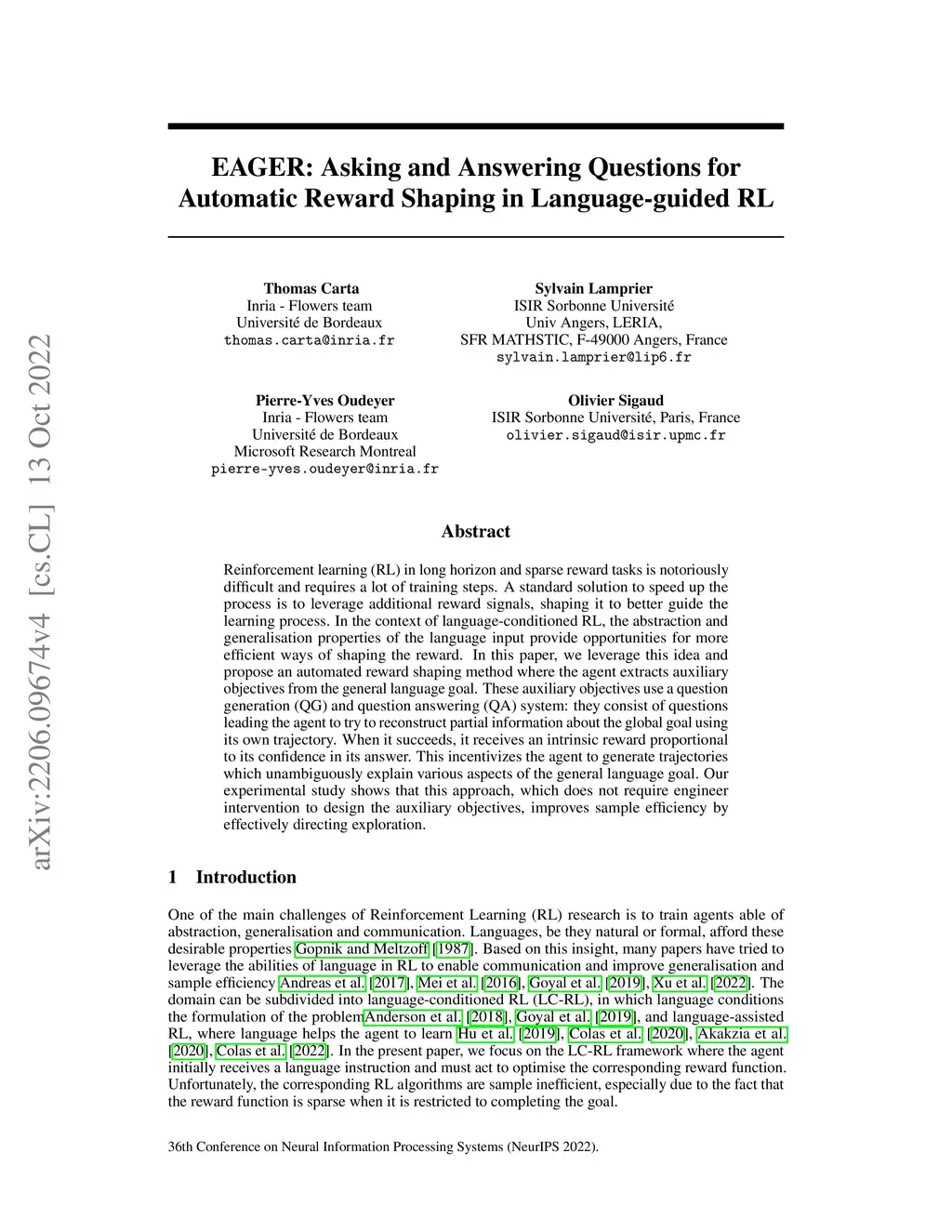 EAGER: Asking and Answering Questions for Automatic Reward Shaping in