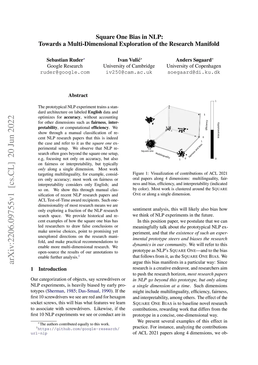 The prototypical NLP experiment trains a standard architecture on labeled English data and optimizes for accuracy, without accounting for other dimensions such as fairness, interpretability, or computational efficiency. We show through a manual classification of recent NLP research papers that this is indeed the case and refer to it as the square one experimental setup. We observe that NLP research often goes beyond the square one setup, e.g, focusing not only on accuracy, but also on fairness or interpretability, but typically only along a single dimension. Most work targeting multilinguality, for example, considers only accuracy; most work on fairness or interpretability considers only English; and so on. We show this through manual classification of recent NLP research papers and ACL Test-of-Time award recipients. Such one-dimensionality of most research means we are only exploring a fraction of the NLP research search space. We provide historical and recent examples of how the square one bias has led researchers to draw false conclusions or make unwise choices, point to promising yet unexplored directions on the research manifold, and make practical recommendations to enable more multi-dimensional research. We open-source the results of our annotations to enable further analysis at https://github.com/google-research/url-nlp
