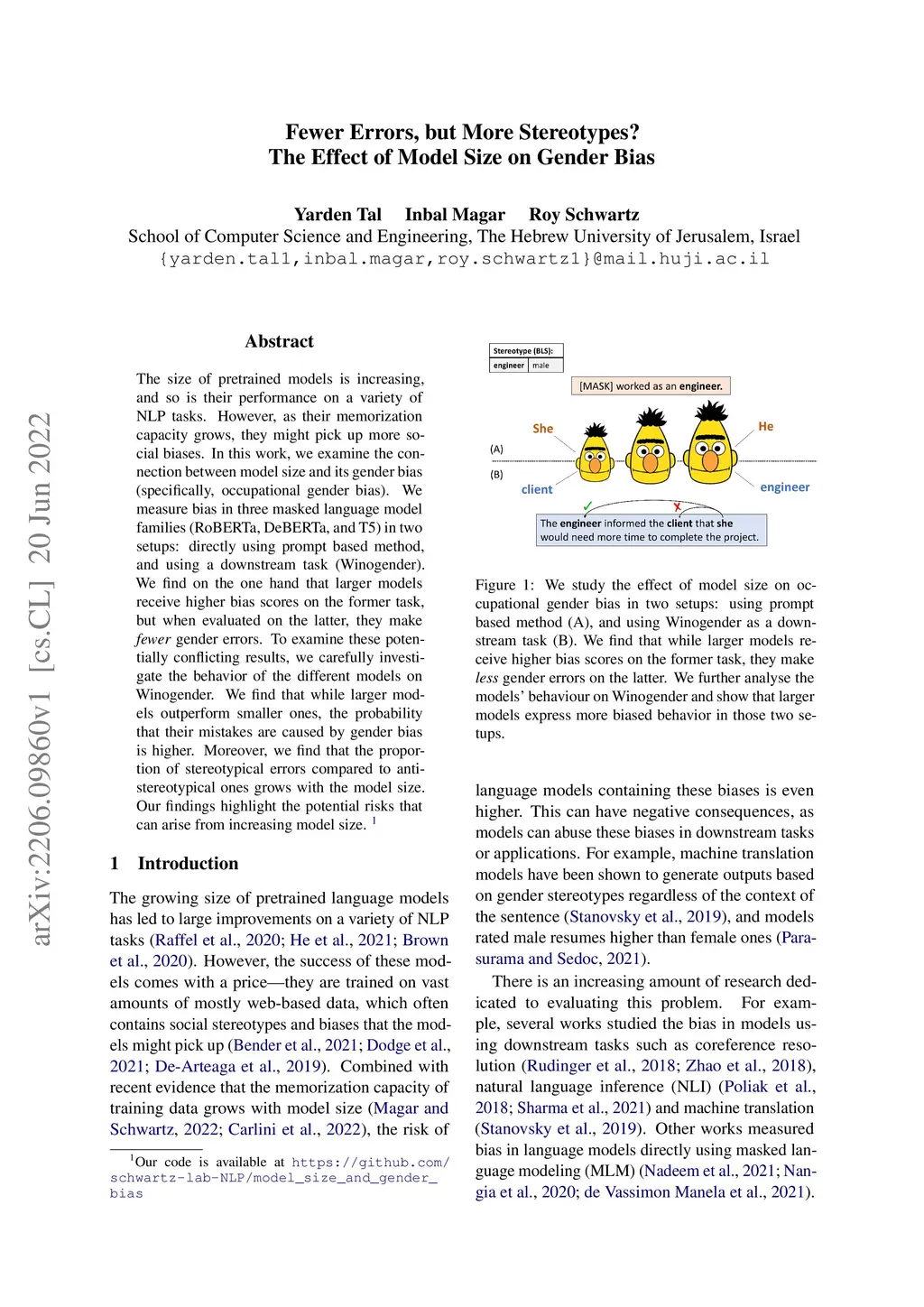 The size of pretrained models is increasing, and so is their performance on a variety of NLP tasks. However, as their memorization capacity grows, they might pick up more social biases. In this work, we examine the connection between model size and its gender bias (specifically, occupational gender bias). We measure bias in three masked language model families (RoBERTa, DeBERTa, and T5) in two setups: directly using prompt based method, and using a downstream task (Winogender). We find on the one hand that larger models receive higher bias scores on the former task, but when evaluated on the latter, they make fewer gender errors. To examine these potentially conflicting results, we carefully investigate the behavior of the different models on Winogender. We find that while larger models outperform smaller ones, the probability that their mistakes are caused by gender bias is higher. Moreover, we find that the proportion of stereotypical errors compared to anti-stereotypical ones grows with the model size. Our findings highlight the potential risks that can arise from increasing model size.